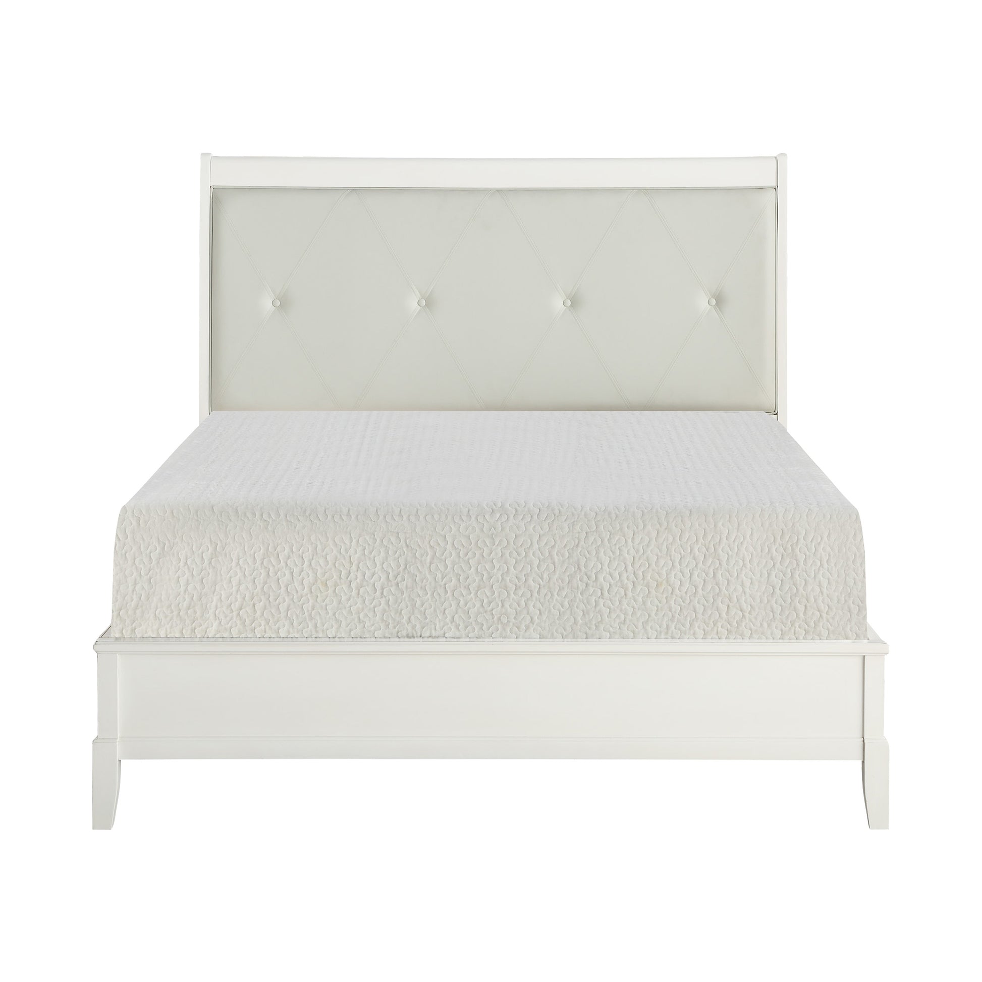With transitional styling that is at home within a number of decorative environments, the Cotterill Collection will be a versatile addition to your bedroom. The white finish, over birch veneer, dramatically enhances the wood’s grain and is perfectly accented by the white faux leather insert with x-stitching and button-tufting that fronts the Eastern King headboard.