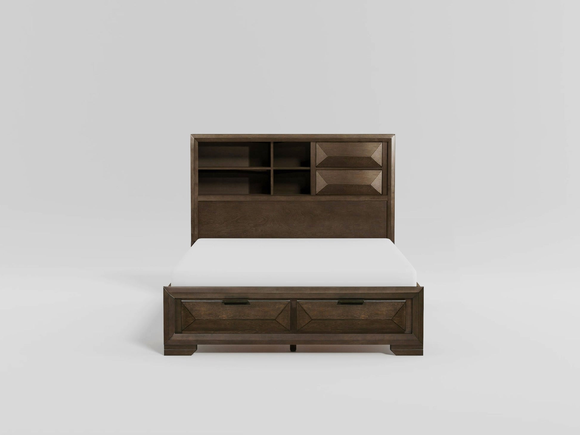 Contemporary design and convenient functionality intersect in the design of the Chesky Collection. Birch veneer is finished in a warm espresso in this unique Eastern King bed offering. Raised panels provide visual interest to the drawer fronts of the headboard and footboard. The bookcase headboard provides ample storage and display space as does the storage drawer footboard.
