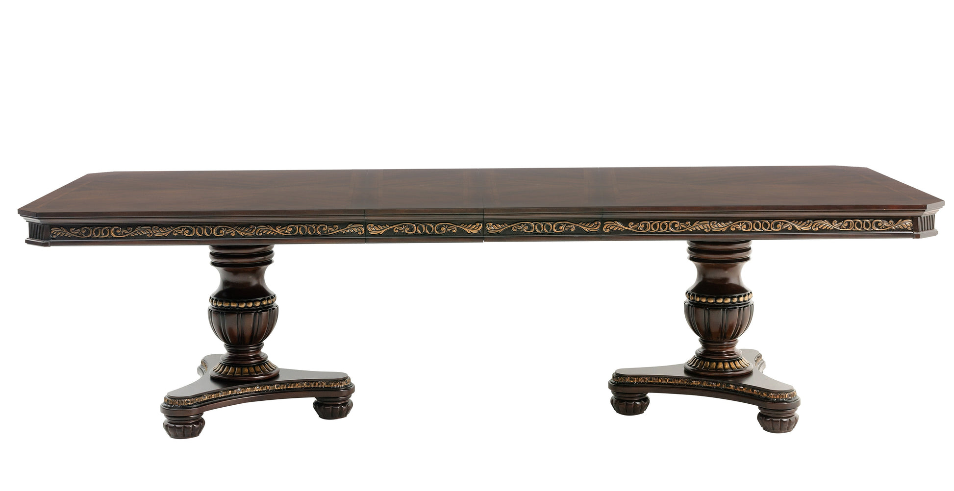 Blending the classic aesthetic of traditional design is the Russian Hill Collection.?The nod to Old World styling comes in elements such as dental, rope and bead molding, shell motifs and faux marble accent, this dining collection goes above and beyond to create the desired look.?An elegant double pedestal table serves the main course of this refined collection.?Acanthus scroll design encompasses the table apron.?