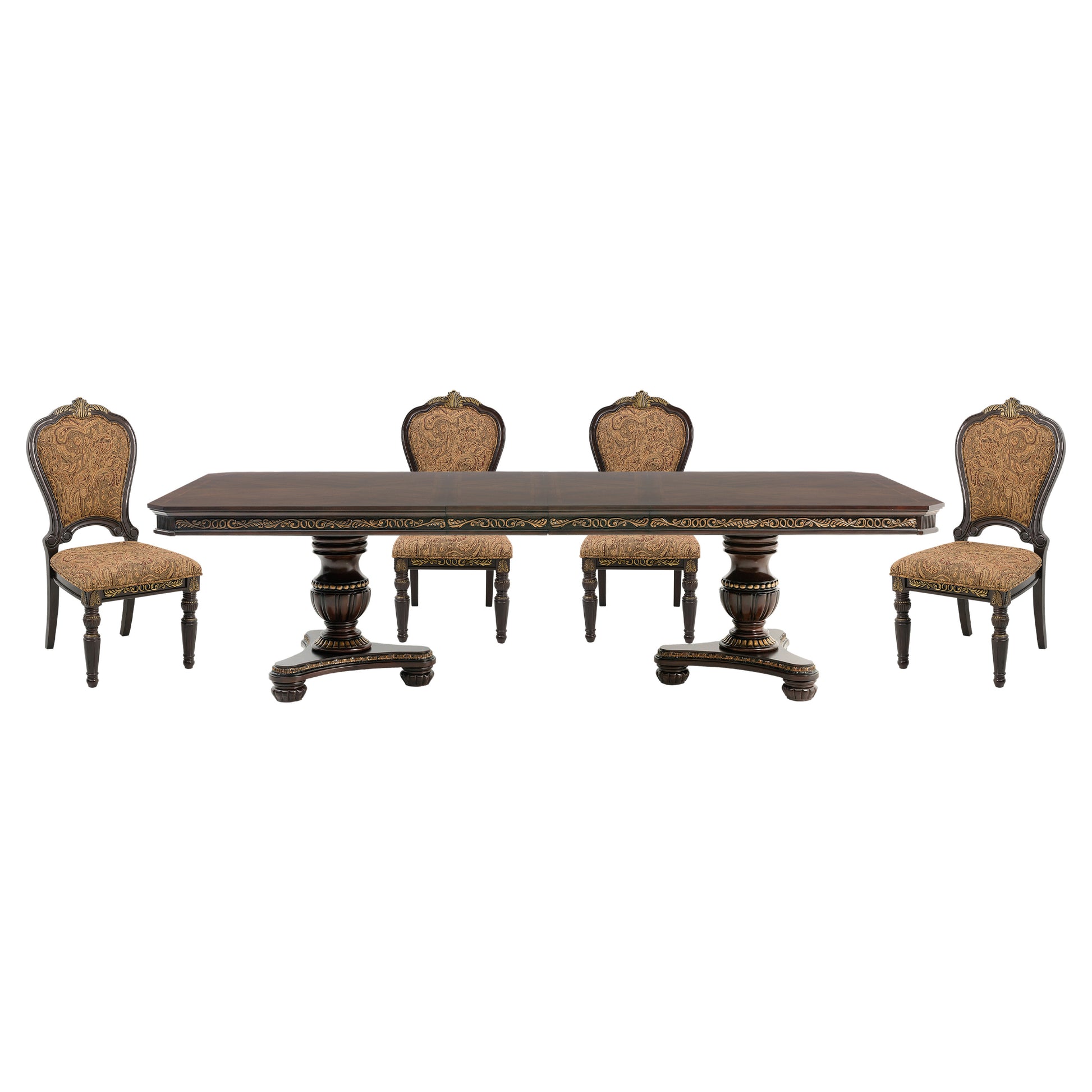 Blending the classic aesthetic of traditional design is the Russian Hill Collection.?The nod to Old World styling comes in elements such as dental, rope and bead molding, shell motifs and faux marble accent, this dining collection goes above and beyond to create the desired look.?An elegant double pedestal table serves the main course of this refined collection.?Acanthus scroll design encompasses the table apron and complement the wood frame fabric chairs.?The stately china stands as the focal point topped with a carved shell accent and elaborate acanthus scroll design.?The server features faux marble top, glass and wood door fronts, wine storage as well as service drawers.?Further lending to the design of the china and server are the fixed antique finished hardware and pilaster accenting in the style of Corinthian columns.?The Russian Hill Collection is offered in a traditional warm cherry finish with gold tipping solidifying the interpretation on traditional décor.