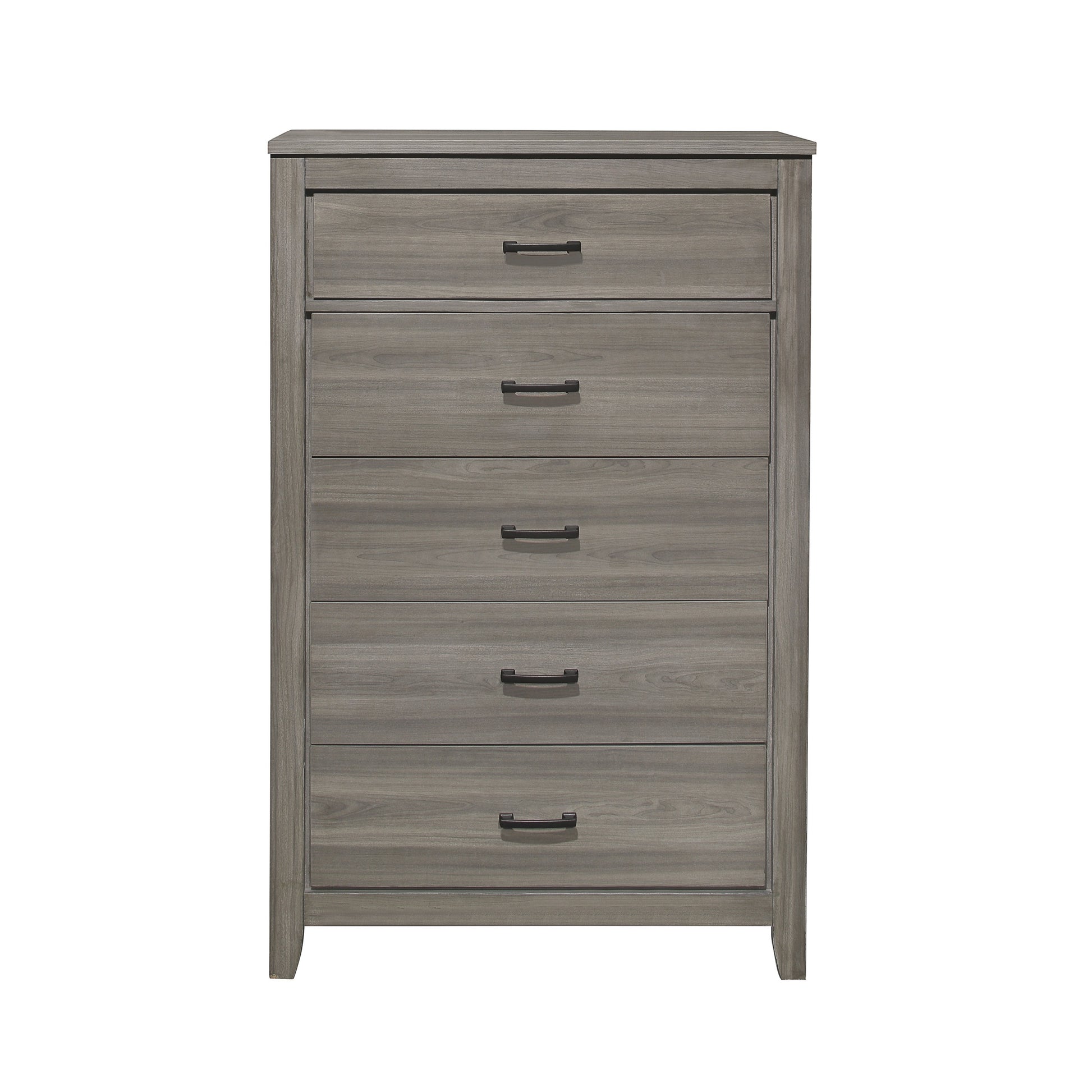With a transitional look that lends to industrial, rustic and modern styling, the Waldorf Collection is a versatile choice for your bedroom. The printed wood grain of the performance laminate is featured in a gray tone allowing for neutral accent to your stylistic environmental choices. The dark finish of the horizontally mounted hardware creates distinct contrast to the neutral tone of the chest’s finish.