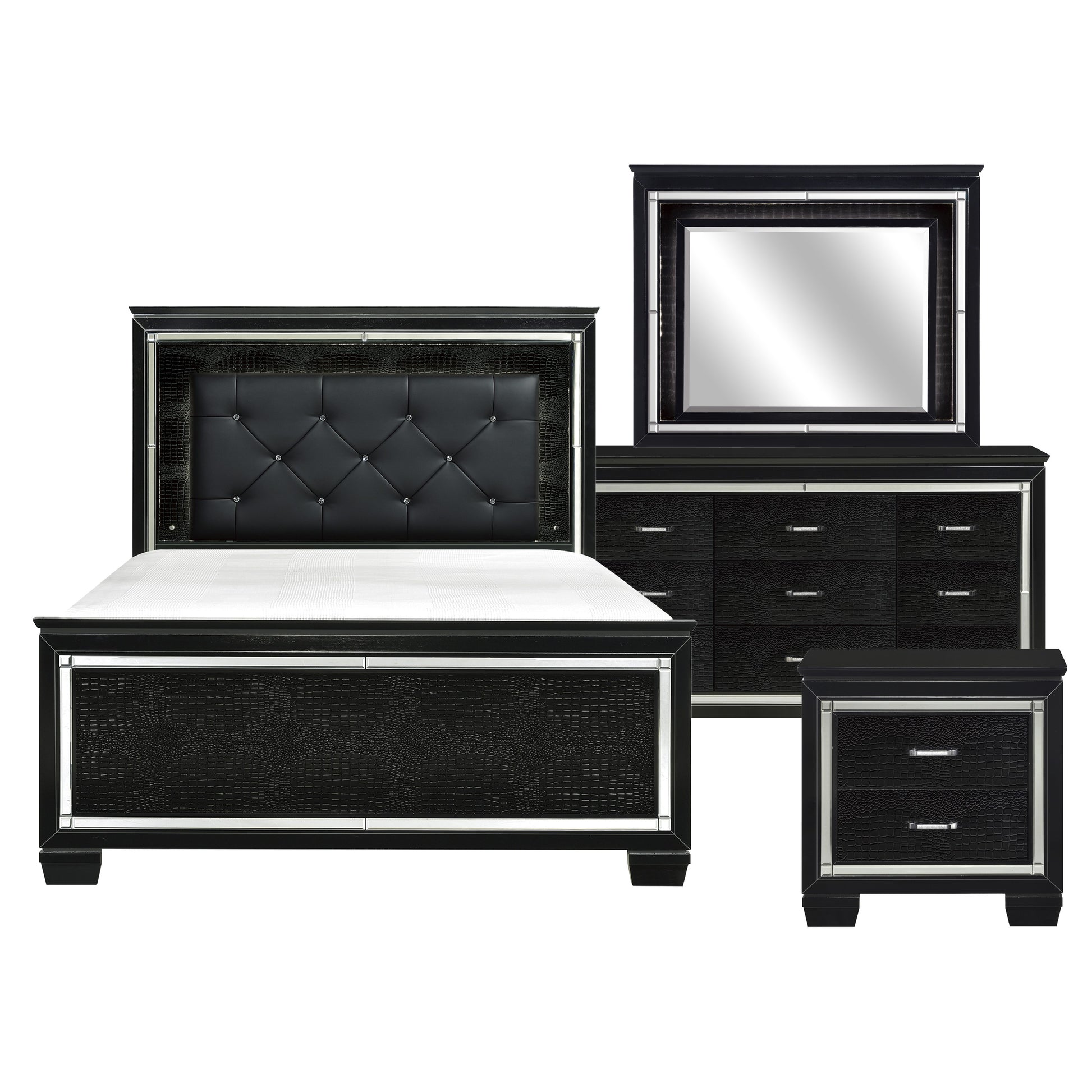 Glamour reigns in the design of the Allura Collection. Framing each piece is a decorative beveled mirror accent that enhances the illumination from the touch-engaged LED backlight of the headboard and mirror, as well as the under-light of the night stand. Alligator embossing and high polished crystal-enhanced hardware boldly accent the black finish as does the black faux leather crystal-tufted headboard insert of the collection.