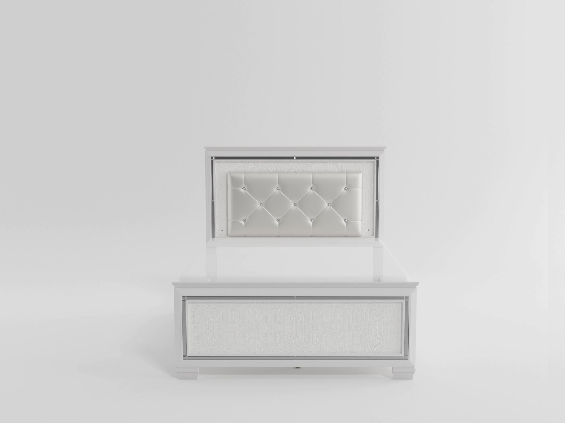 Glamour reigns in the design of the Allura Collection. Framing the California King bed is a decorative beveled mirror accent that enhances the illumination from the touch-engaged LED backlight of the headboard. Alligator embossing and high polished crystal-enhanced hardware boldly accent the white finish as does the pearl-white faux leather crystal-tufted headboard insert.
