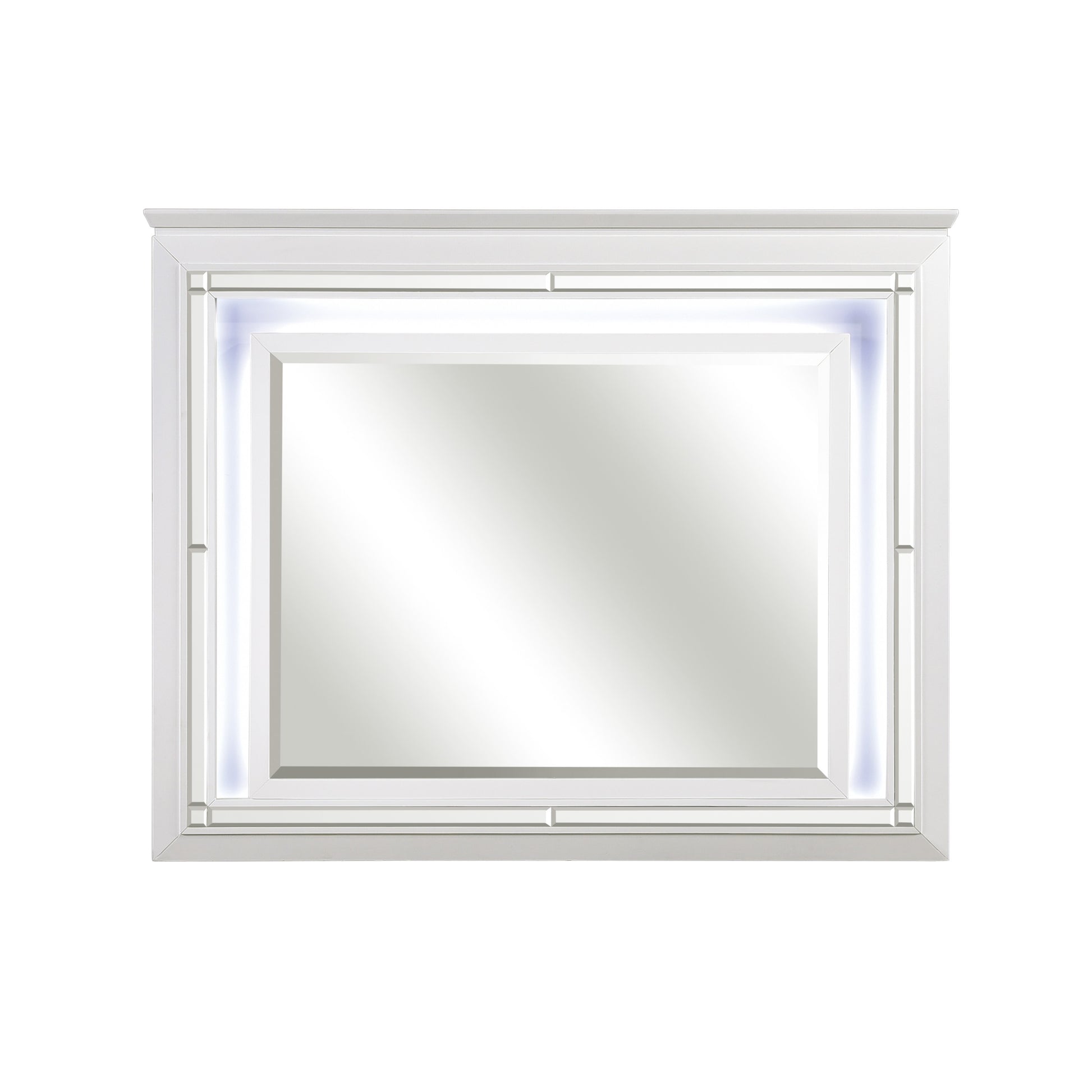 Glamour reigns in the design of the Allura Collection. Framing each piece is a decorative beveled mirror accent that enhances the illumination from the touch-engaged LED backlight of the headboard and mirror, as well as the under-light of the night stand. Alligator embossing and high polished crystal-enhanced hardware boldly accent the white finish as does the pearl-white faux leather crystal-tufted headboard insert of the collection.