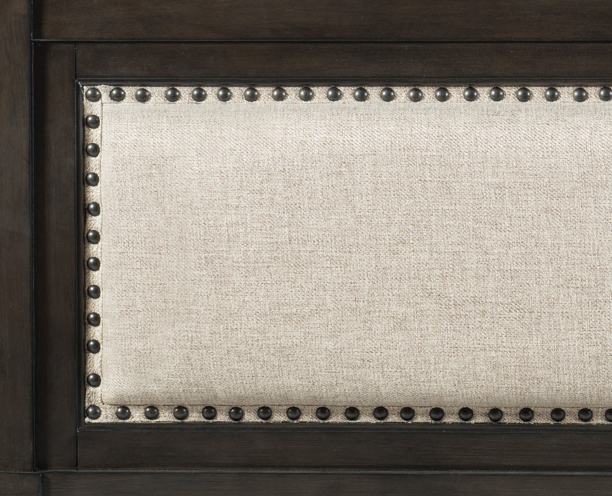 The transitional styling of the Hebron Collection creates a versatile look for your bedroom. The sleigh bed has a subtle curve to its profile which serves as defining contrast to the clean lines of the collection’s case pieces. Further complementing the bed’s look is the beige woven fabric and nailhead accent that grace the front the headboard and footboard. The nightstand, dresser and chest each feature dark bronze finished cup hardware, providing complementing accent to the dark cherry finish that accentuates the birch veneer and poplar solids.