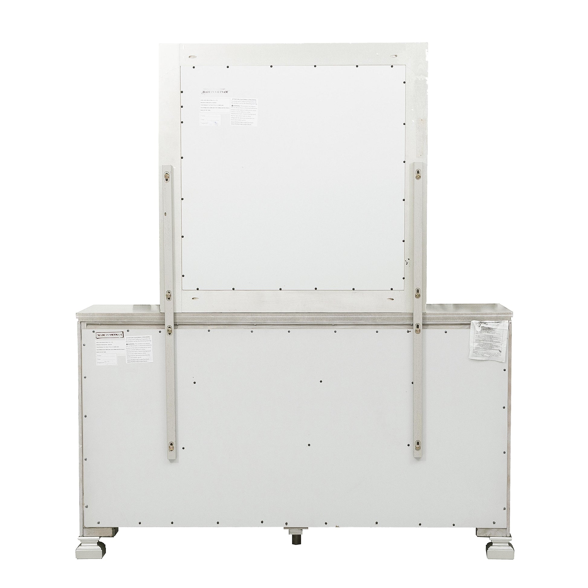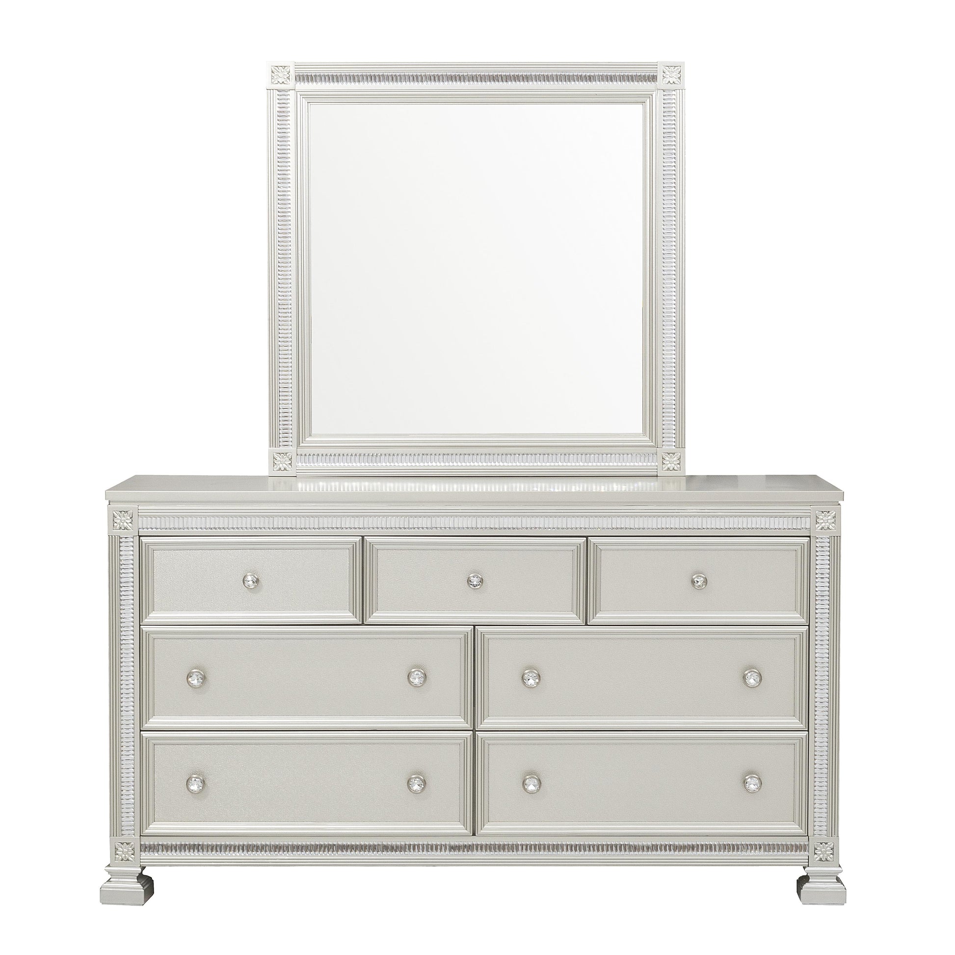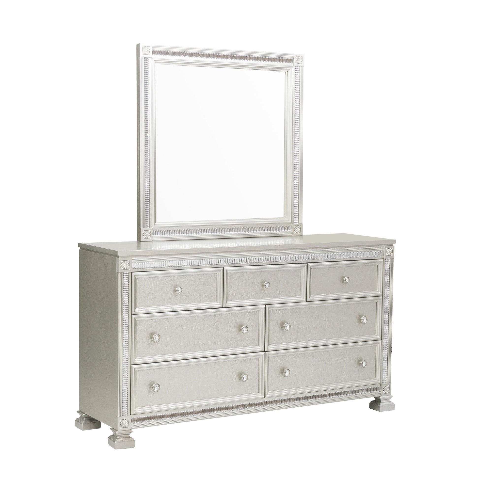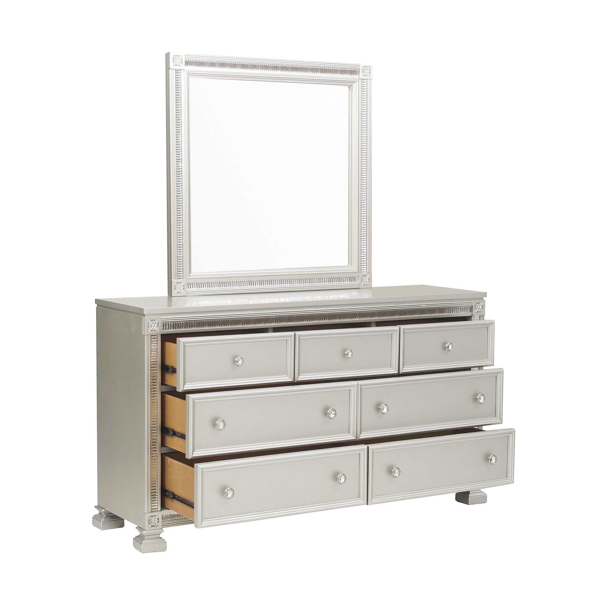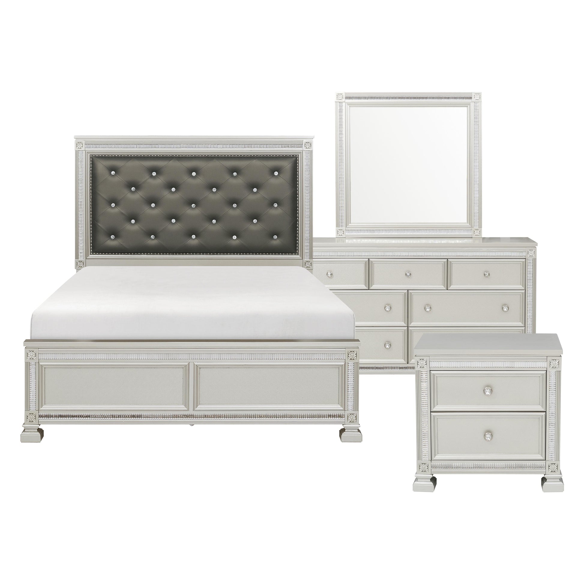 Modern glamour is exemplified in the design of the Bevelle Collection. Acrylic crystals frame each piece in the collection, reflecting the light to create eye-catching drama. The silver finish serves as the perfect complement to the high-polish decorative knob hardware and medallion accents. A stylish mirrored vanity, with coordinating stool, provides additional function to the collection. Providing contrast to finish is the dark gray faux leather, button-tufted headboard panel. A coordinating dining room is also available.