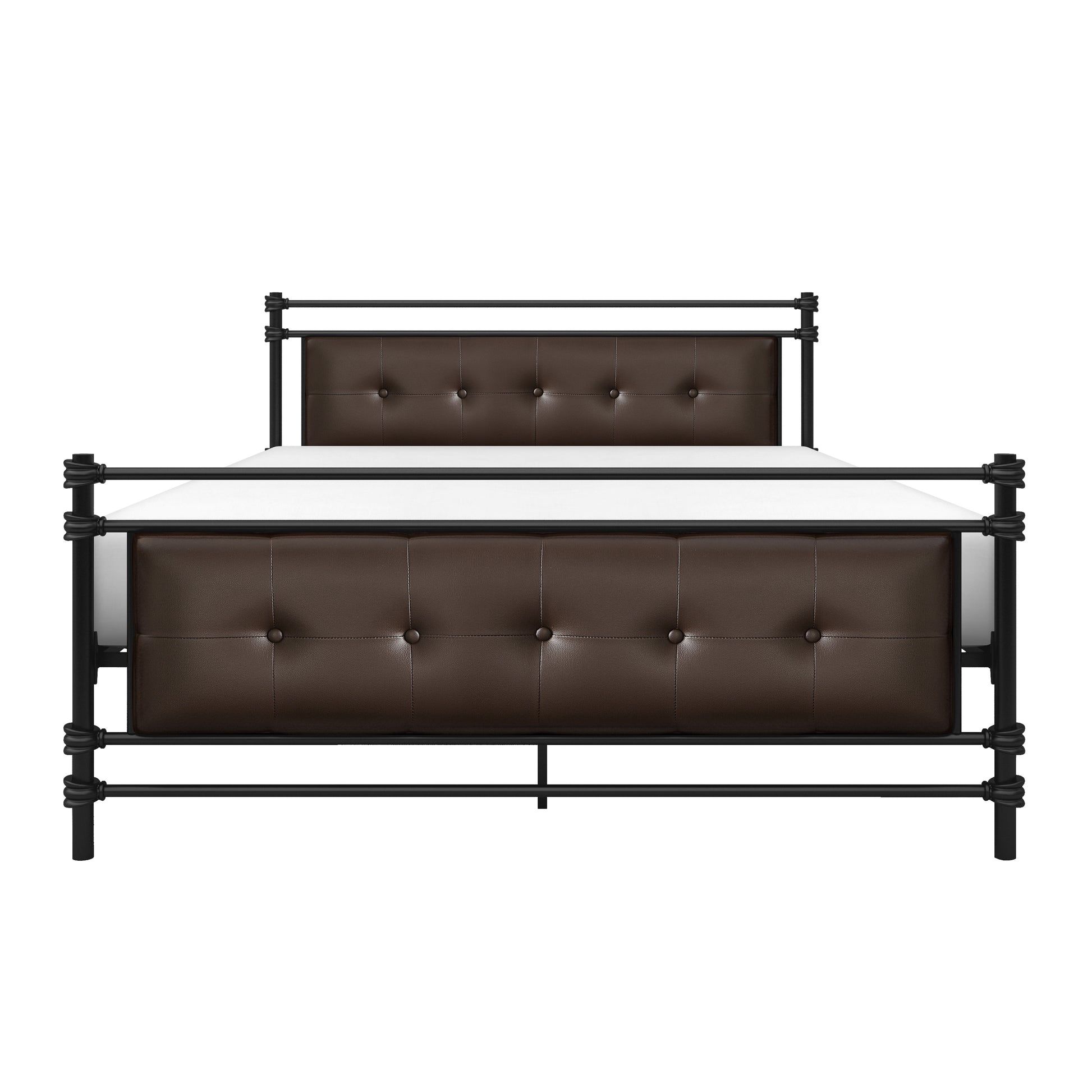 Modern traditional styling is utilized to create the design of the Jayla Collection. Black metal framing is perfectly contrasted by the brown faux leather button-tufted inserts of the full size headboard and footboard, creating a unique look for your bedroom. The collection is also offered in twin.