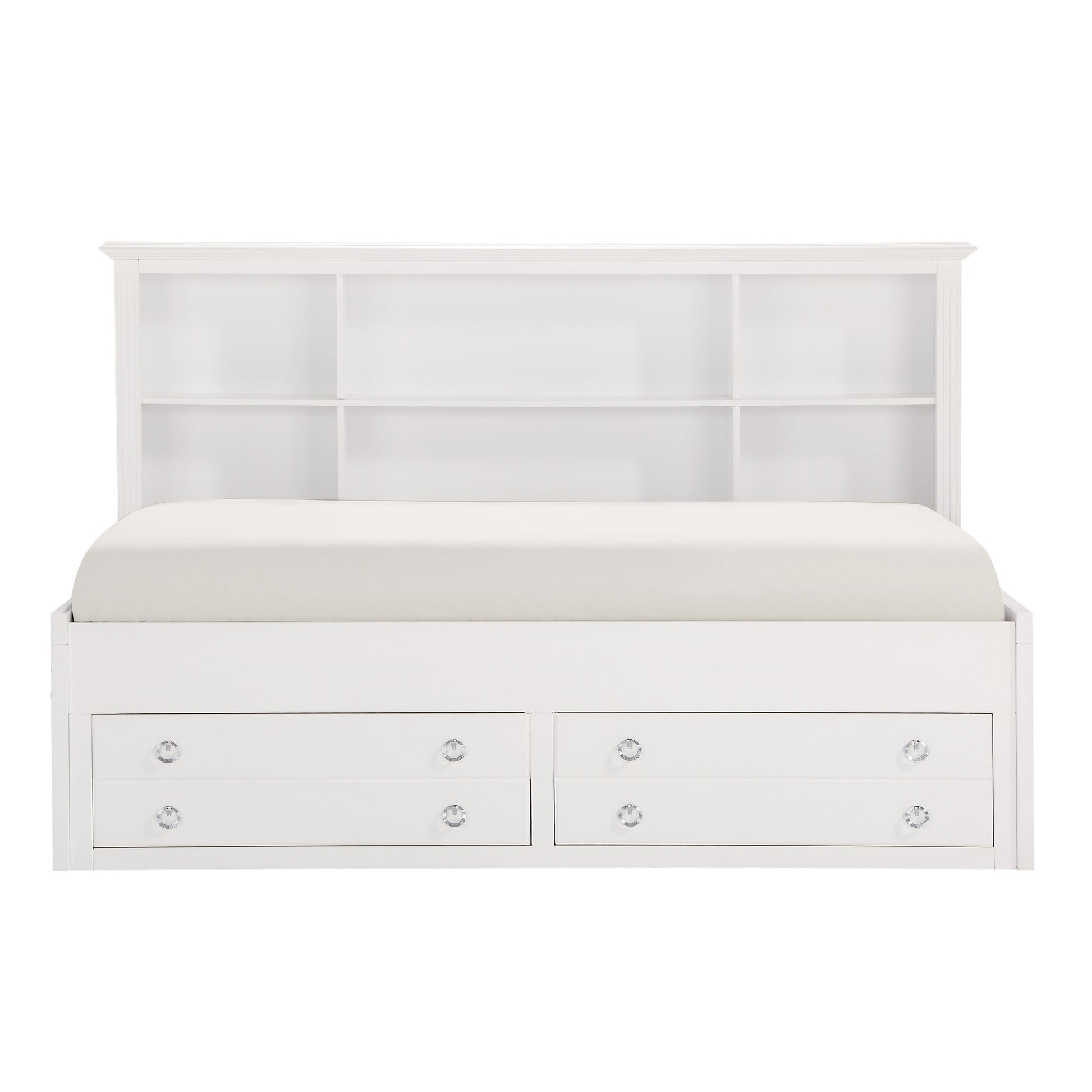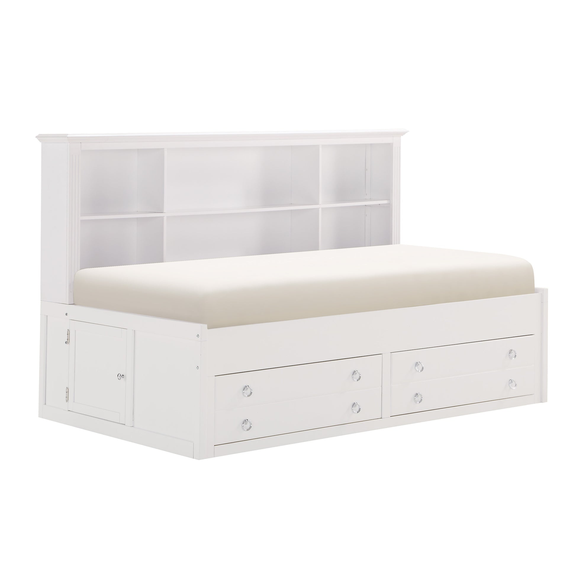 Your child’s bedroom is their space to grow, learn and play. The elegant, yet whimsical, styling of the Meghan Collection will provide the platform from which they will enjoy those experiences for years to come. Design elements that lend to a traditional look include, white finish, routed pilasters, high polish round pull hardware. Your child will love this fun full lounge bed, with ample storage space contained within drawers, behind doors and open bookcase display.