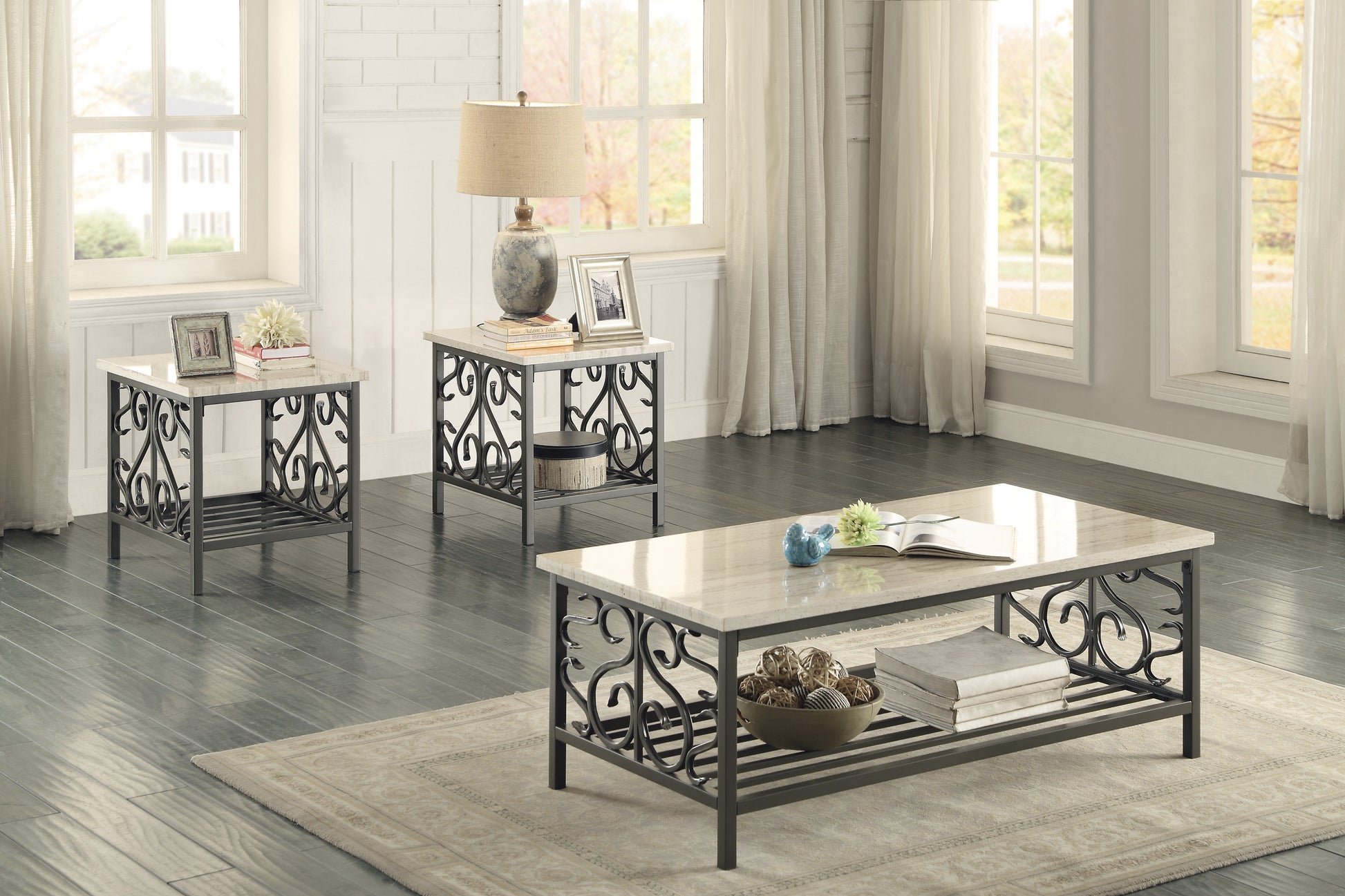 Metal scroll-work lends a feminine touch to the side supports of the beautiful Fairhope Collection. The display shelf metal bases of this three-piece occasional collection rise to support faux marble tops creating a timeless look. A matching sofa table, which can also be served as a TV stand, is featured in this collection.