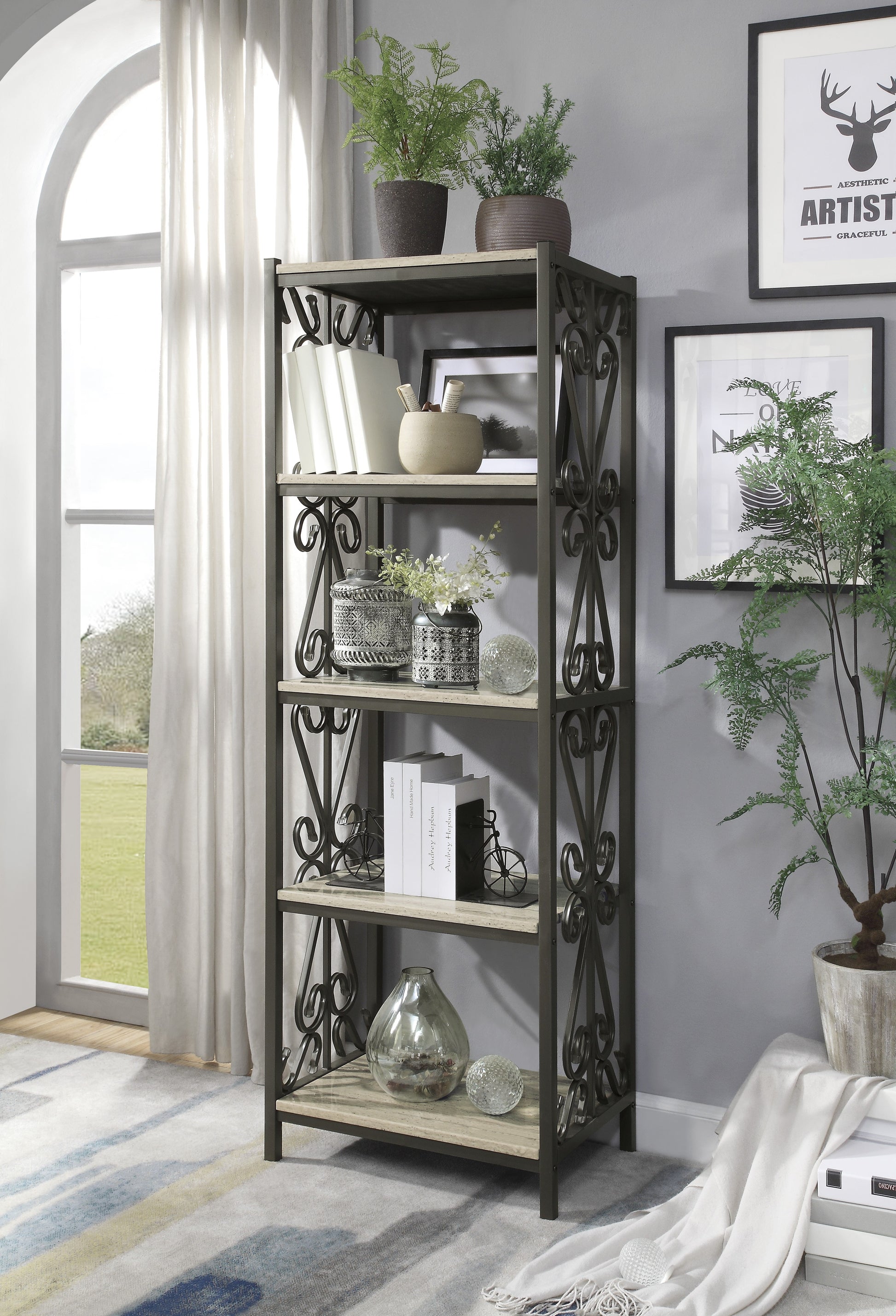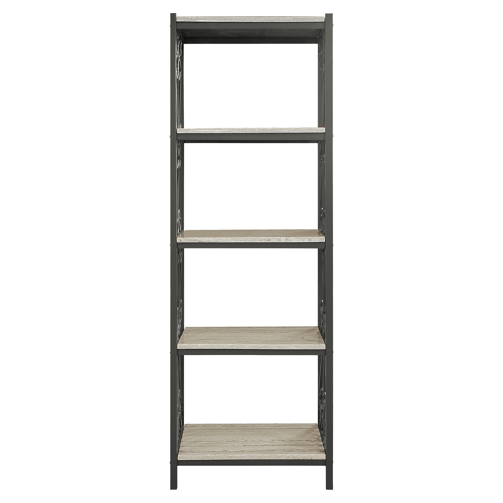 Metal scroll-work lends a feminine touch to the side supports and framing of the beautiful Fairhope Collection. The open display shelves of this bookcase feature faux marble tops creating a timeless look and elegant functionality. When paired with another bookcase and console unit, a full entertainment wall unit is created.