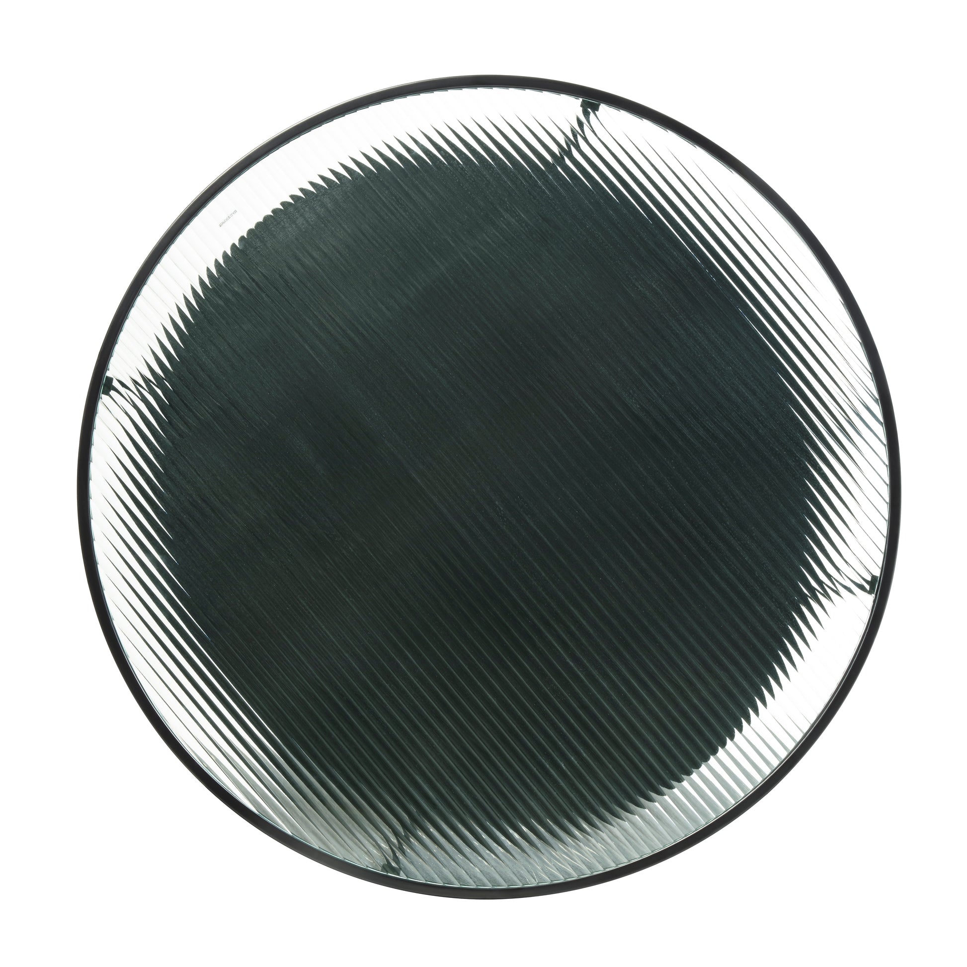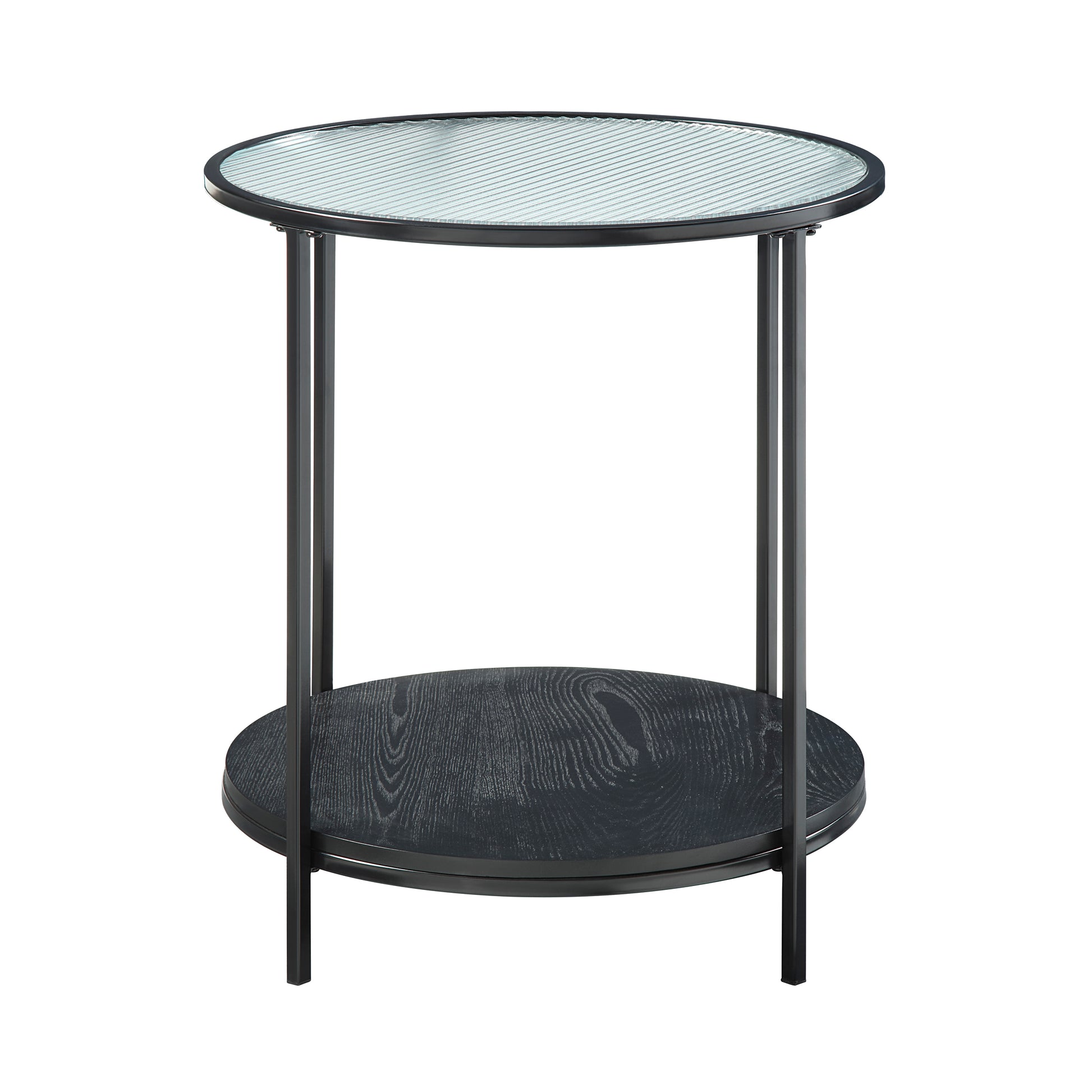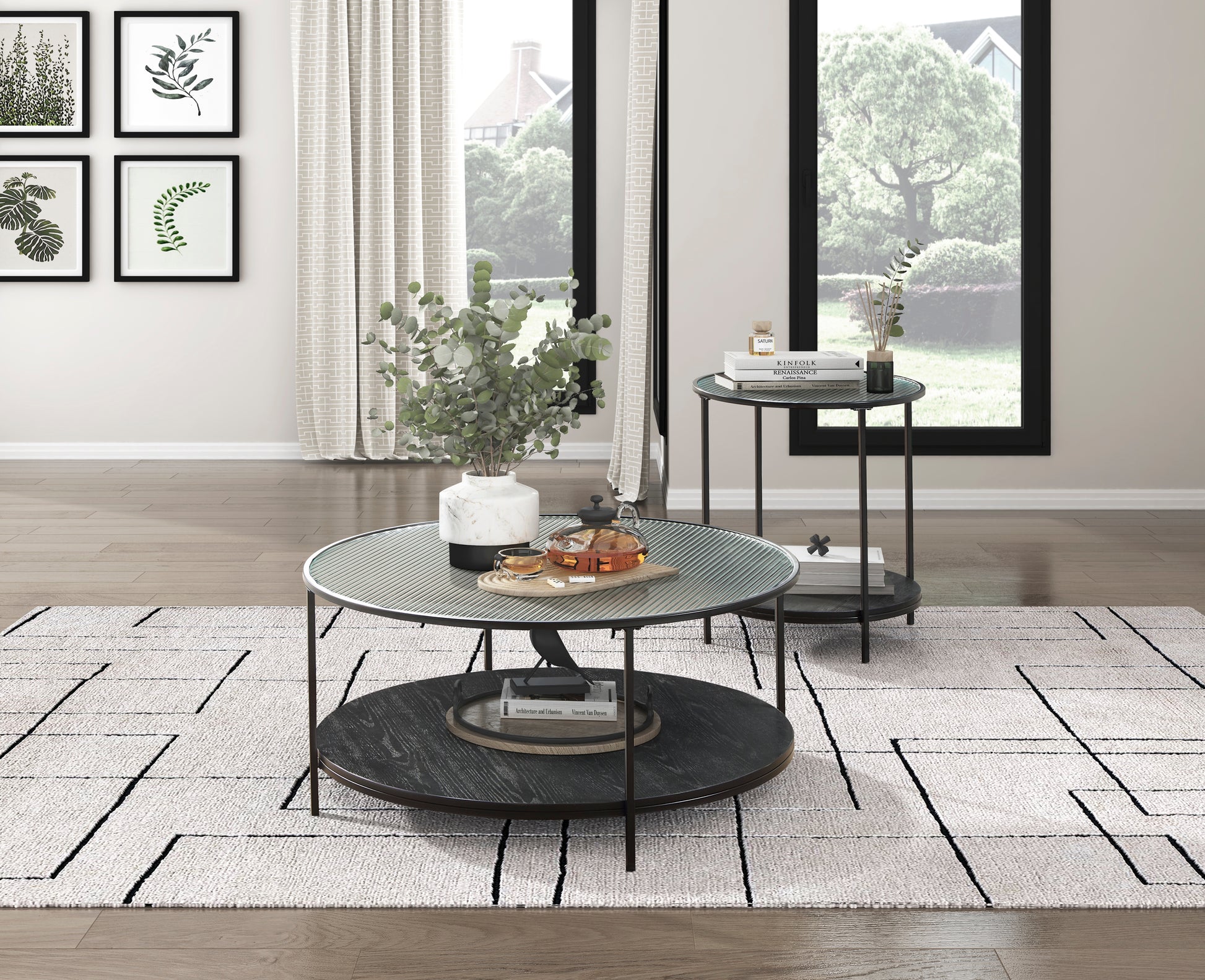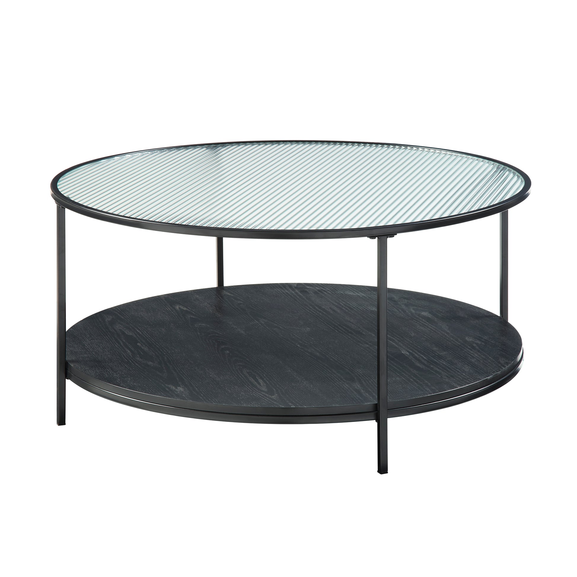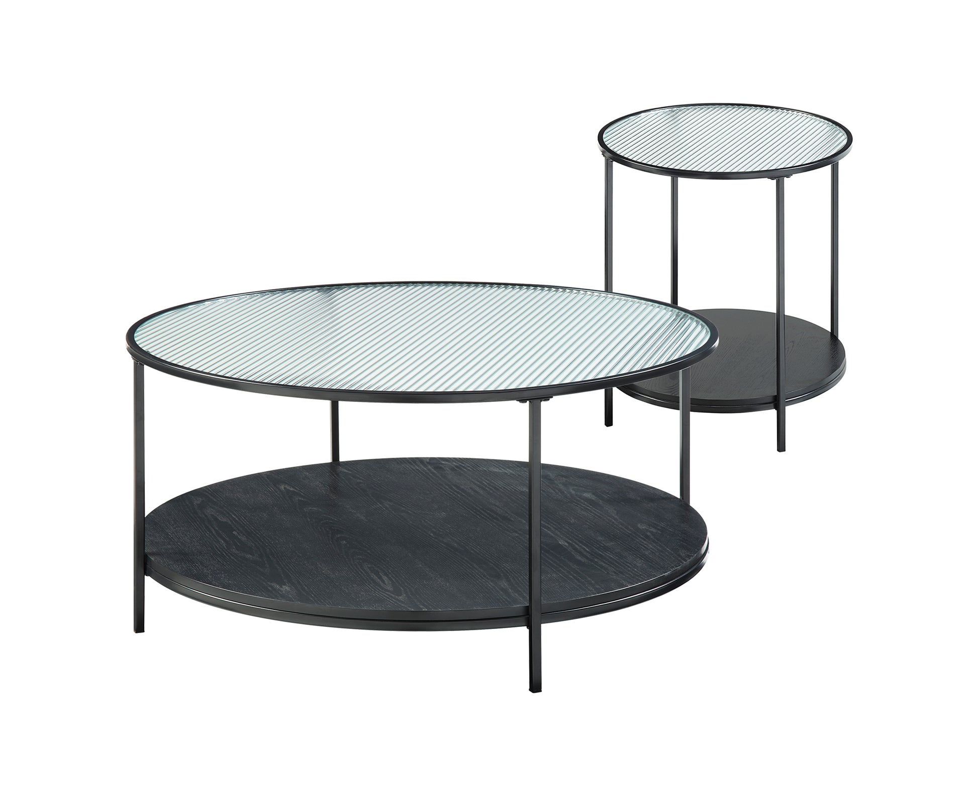 Fluted glass tops the tables of the Zephyr Collection, the linear design creating distinct contrast to the round profile of the cocktail table and end table. Black-finished metal comprises the construction of the tables, serving to support the glass top and black-finished wood display shelf.