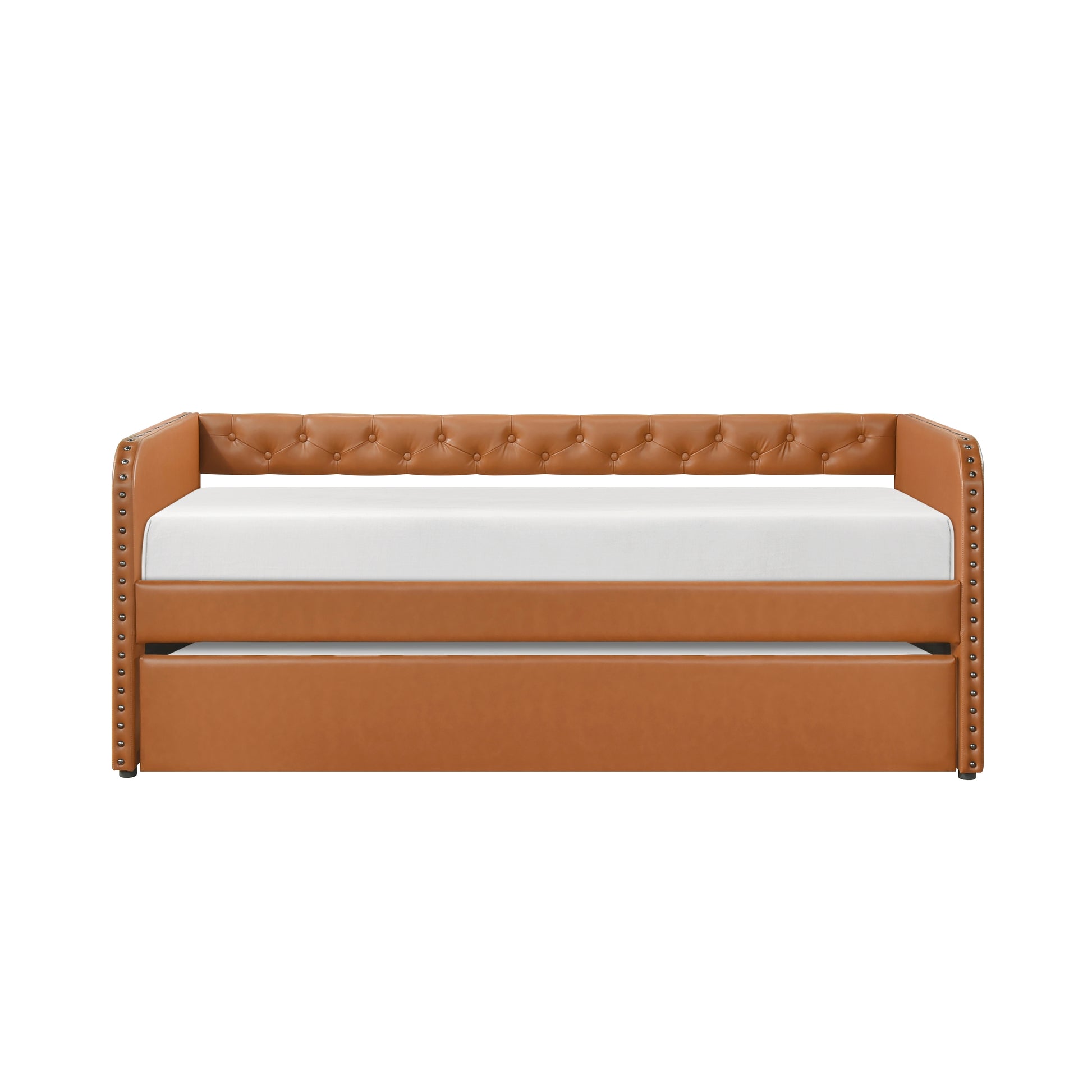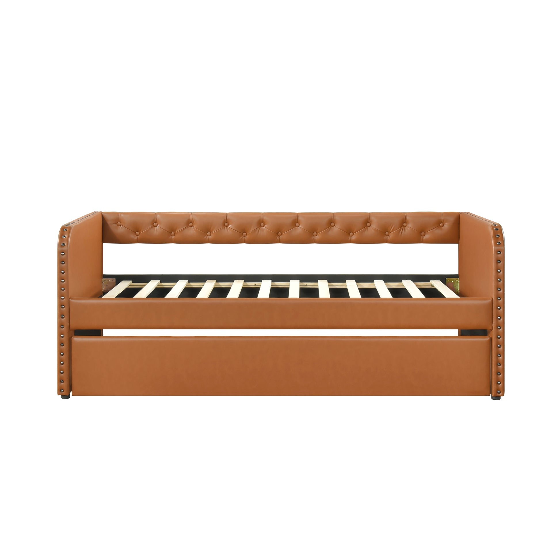 Maximize your space with this stylish and functional faux leather daybed, perfect for guest rooms or multi-purpose spaces. Featuring a sturdy plywood and engineered wood frame, this daybed is upholstered in a durable faux leather with elegant button-tufted detailing and nailhead trim. The convenient pull-out trundle bed with casters provides extra sleeping space for guests, and the design eliminates the need for a foundation or box spring. With easy assembly and shipping in one box, this daybed offers a practical and stylish solution for your home.