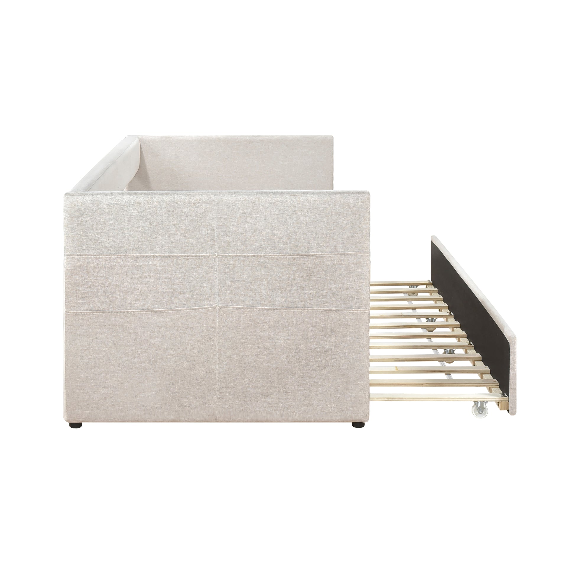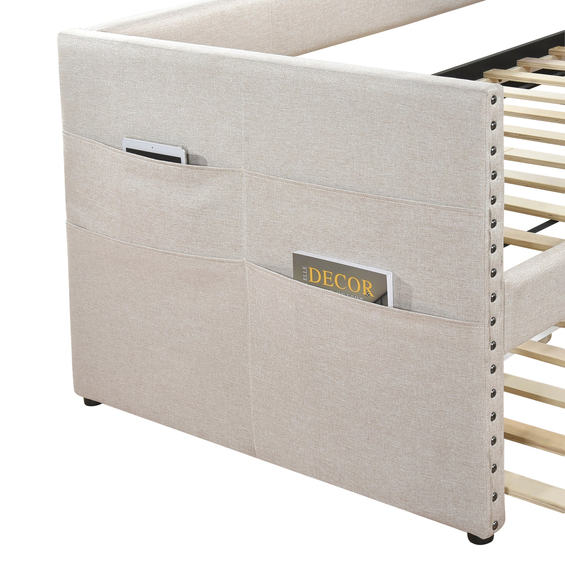 Maximize your guest room or living space with this stylish beige textured fabric daybed, featuring a convenient pull-out trundle bed for extra sleeping space. Crafted with a sturdy plywood and engineered wood frame, soft textured fabric upholstery, and elegant nailhead trim, this daybed offers both comfort and sophistication. The trundle bed, equipped with casters for easy movement, provides a seamless sleeping solution for overnight guests. Each side features convenient storage pockets for personal items. Designed to eliminate the need for a foundation or box spring, this daybed offers a sleek, modern look that complements various décor styles. Assembly is required and it ships in one box.