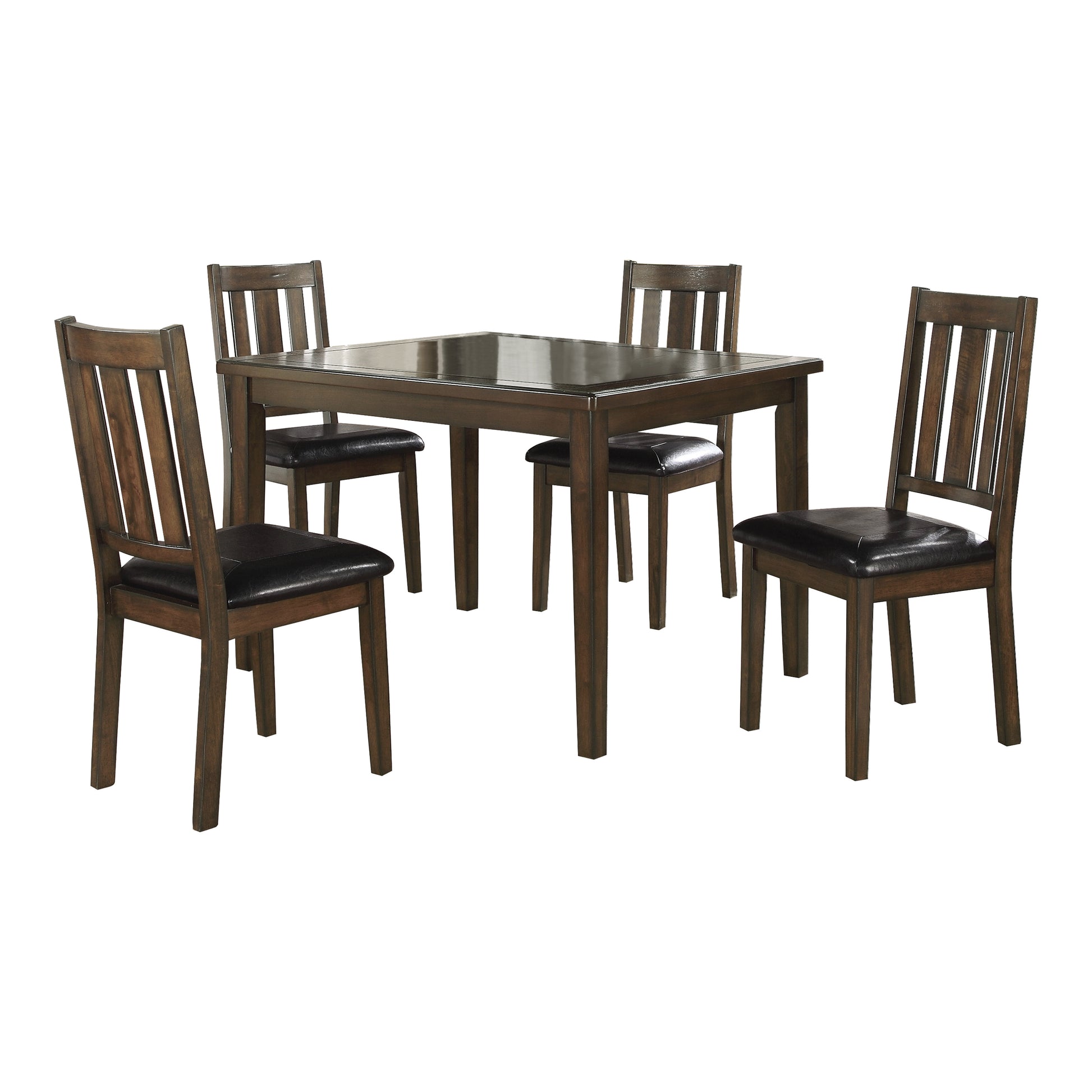 Designed for your cozy dining nook, the transitionally styled Mosely Collection will be a perfect fit. Vertical slat back chairs– featuring black faux leather seating with contour stitching – flank the routed tabletop. The five-piece dining collection isoffered in a dark brown cherry finish.