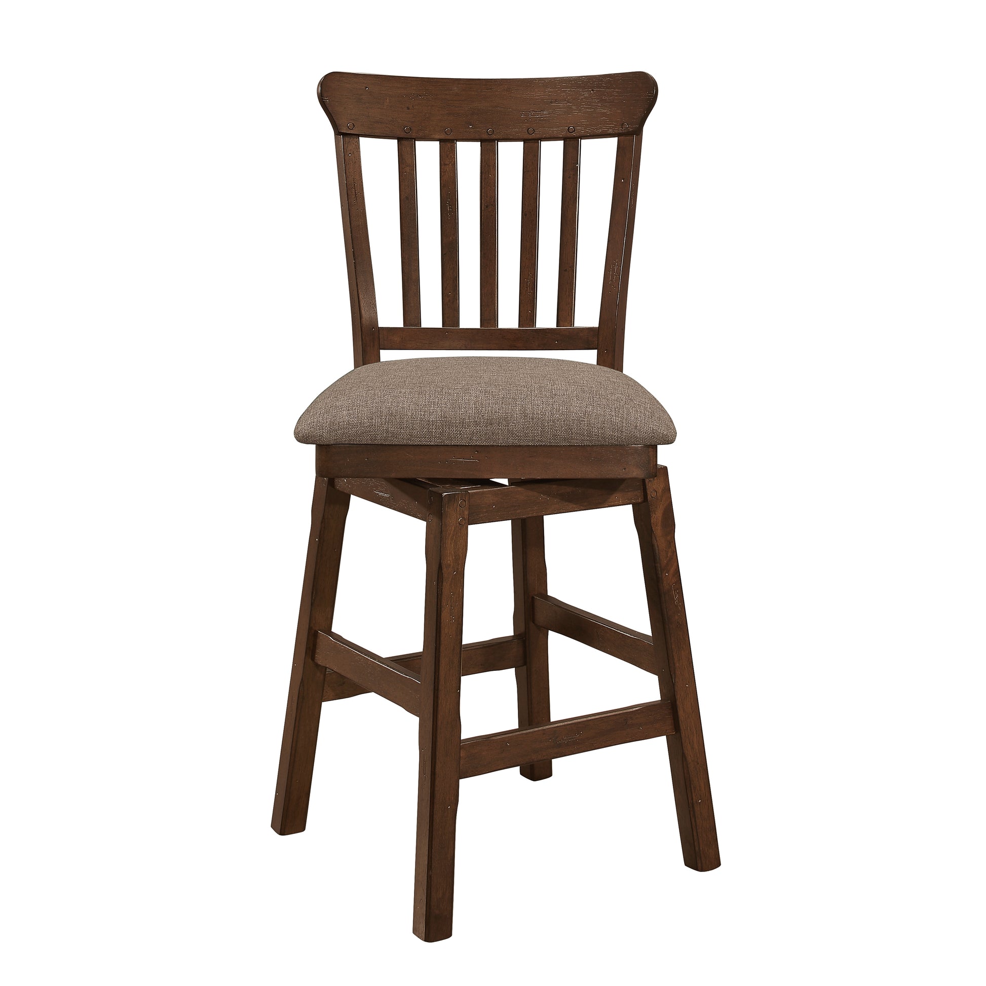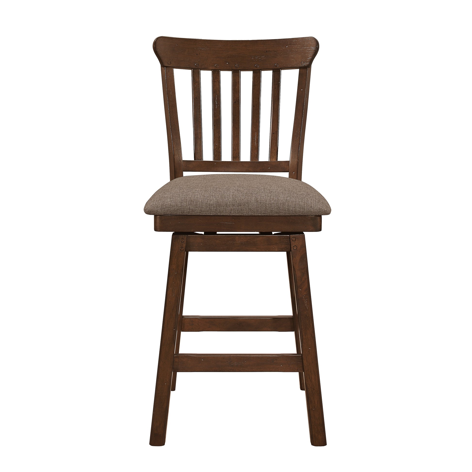 Transitionally styled with a burnished brown finish, the Schleiger Collection features bold accenting and functional storage options. A sturdy storage base supports the metal and rivet banded counter-height table top, with swivel chairs and bench flanking allowing for versatile seating options for this industrial influenced collection. Metal and rivet banding with nailhead accent also features prominently on the open buffet, and mobile kitchen cart that are available for this collection.