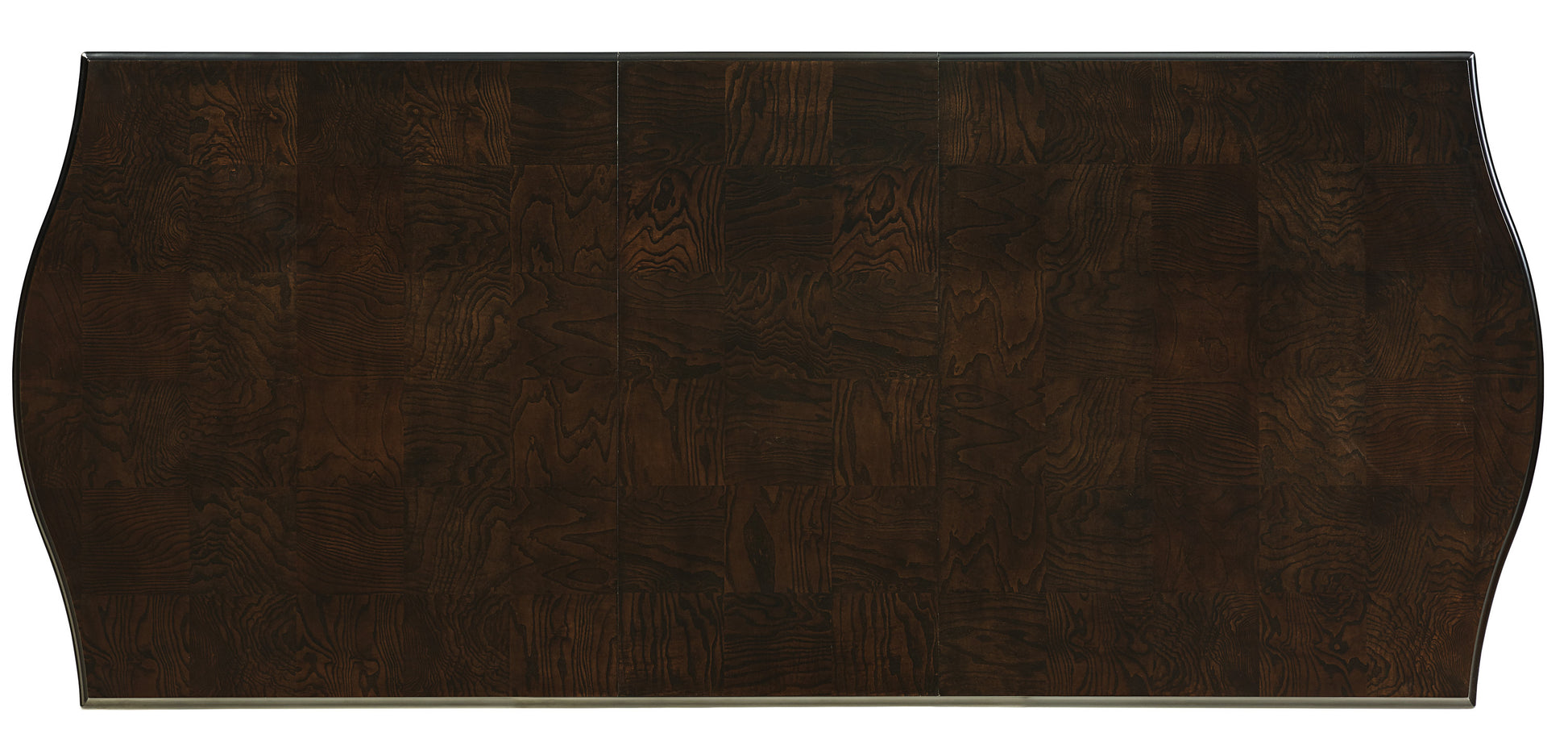 Sophisticated soft contemporary design is achieved in your dining room with the addition of the Savion Collection. Rectangular double pedestal table featuring a distinct birdcage style base. An espresso finish highlights the unique veneer pattern. Dramatic flair is lent to the design by the accompanying chairs. Neutral tone fabric covers the substantially sized roll back arm and side chairs. Reeded fronts on the server along with the serpentine profile further the elegance of this distinctly sophisticated collection.