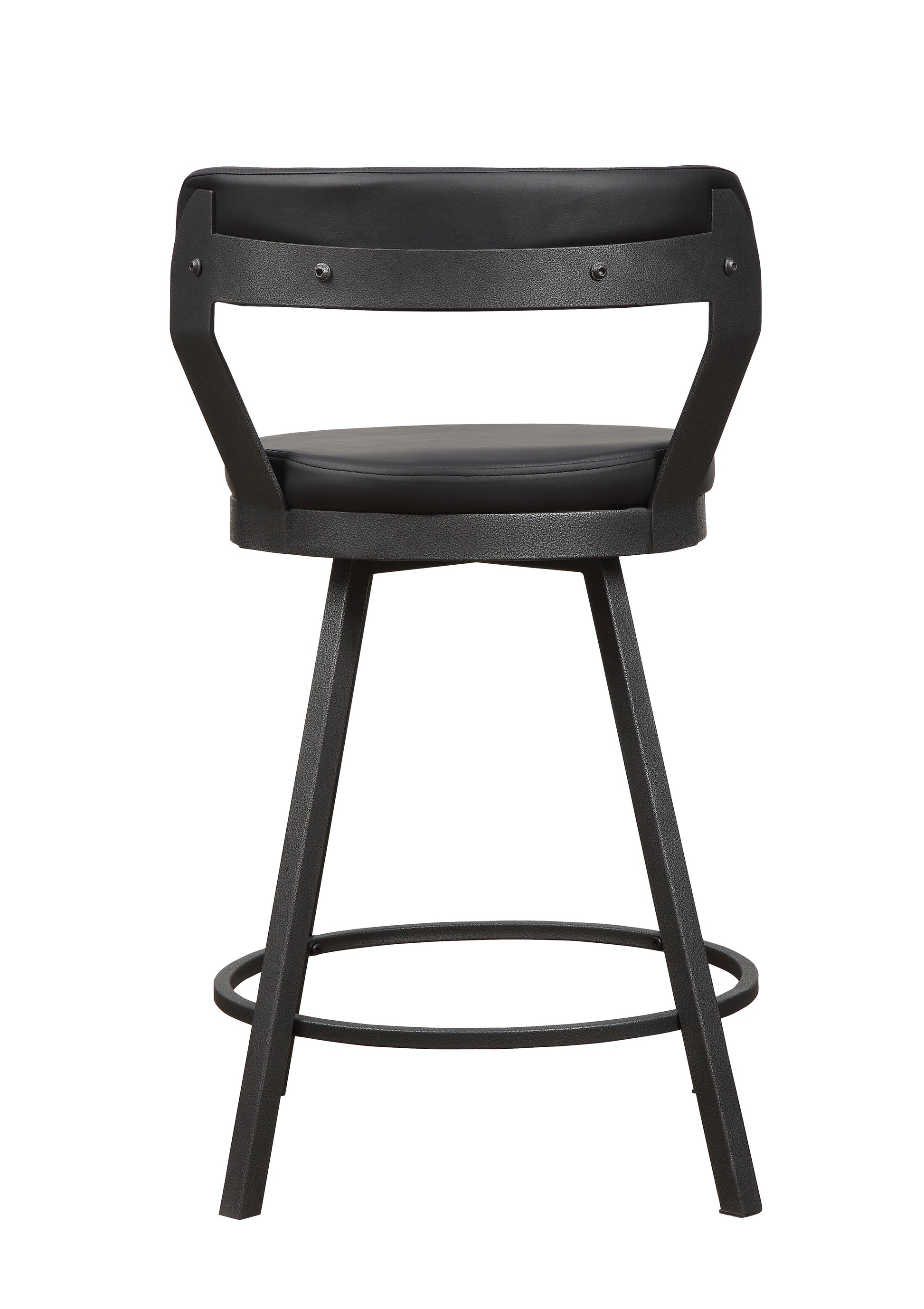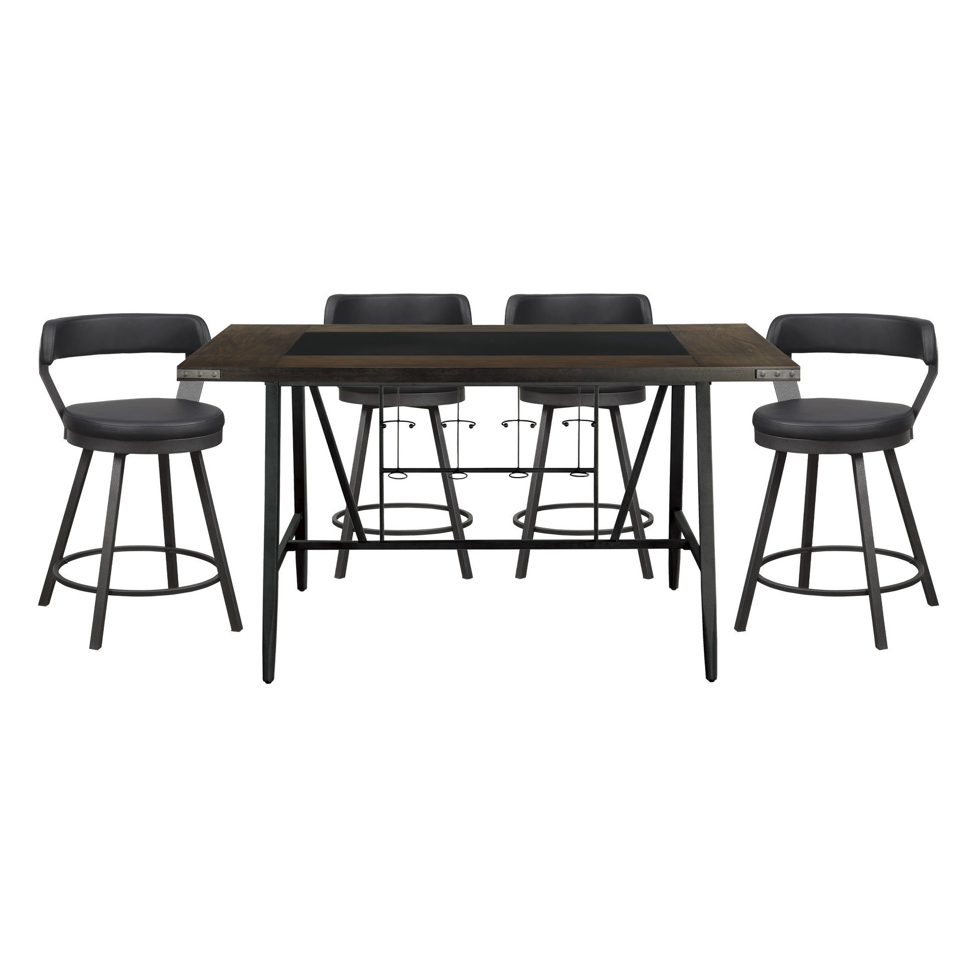 Perfectly styled for your casual dining room is the Appert Collection. This counter height offering features a dark gray metal base – with built in wine rack – that serves to support the wood top which frames a black rectangular glass insert. The round seats and back supports of the accompanying chairs are covered in faux leather.