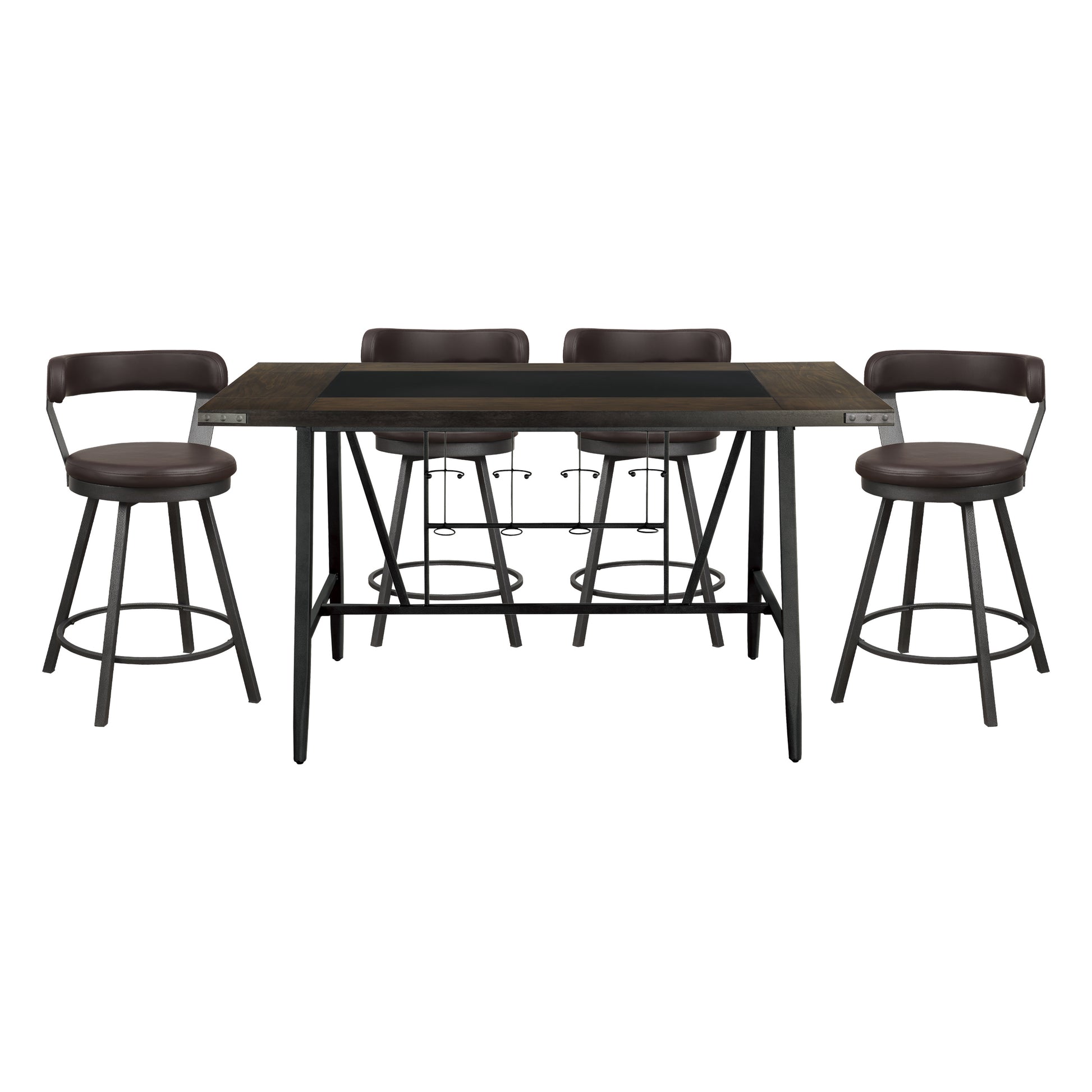 Perfectly styled for your casual dining room is the Appert Collection. This counter height offering features a dark gray metal base – with built in wine rack – that serves to support the wood top which frames a black rectangular glass insert. The round seats and back supports of the accompanying chairs are covered in faux leather.