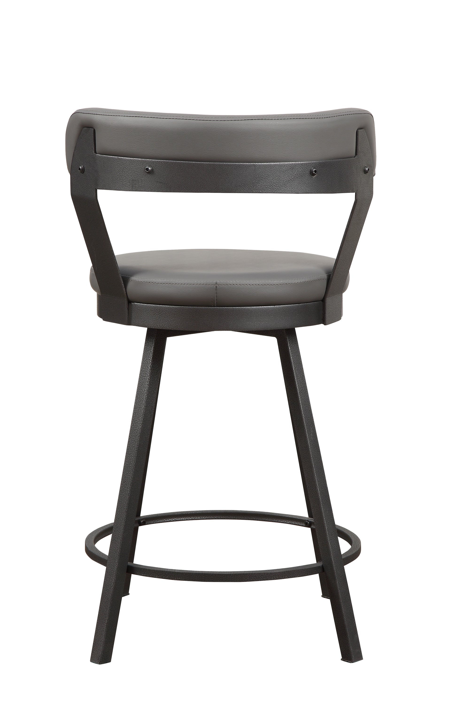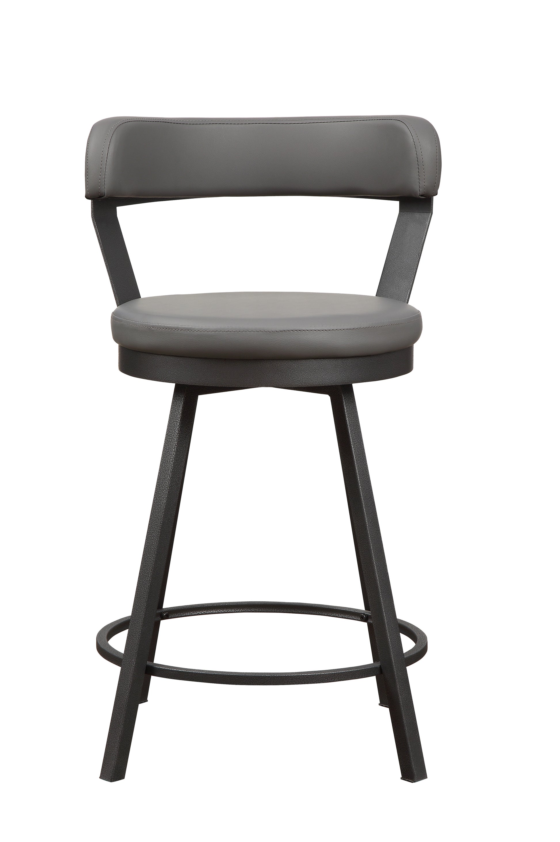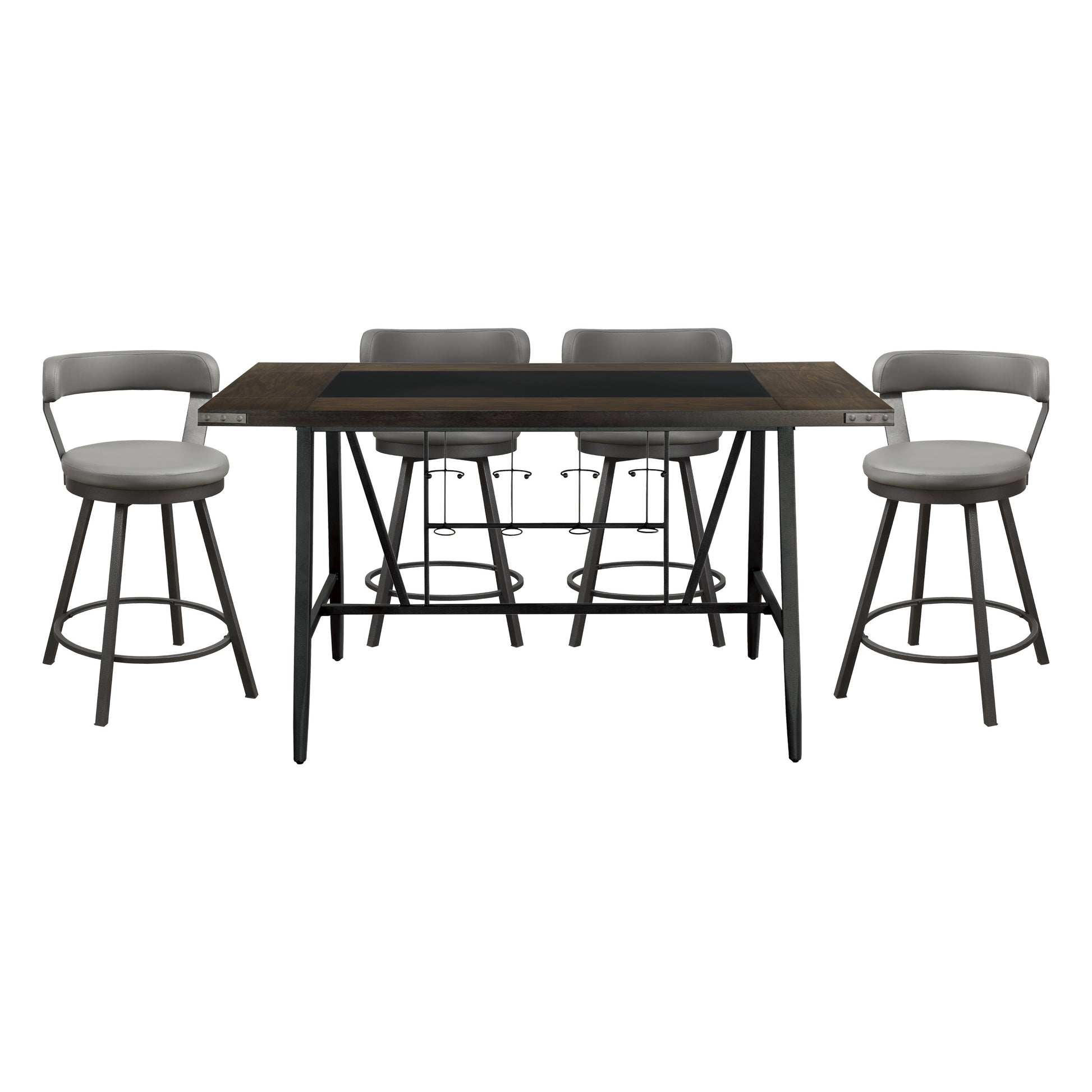 Perfectly styled for your casual dining room is the Appert Collection. This counter height offering features a dark gray metal base – with built in wine rack – that serves to support the wood top which frames a black rectangular glass insert. The round seats and back supports of the accompanying chairs are covered in faux leather.