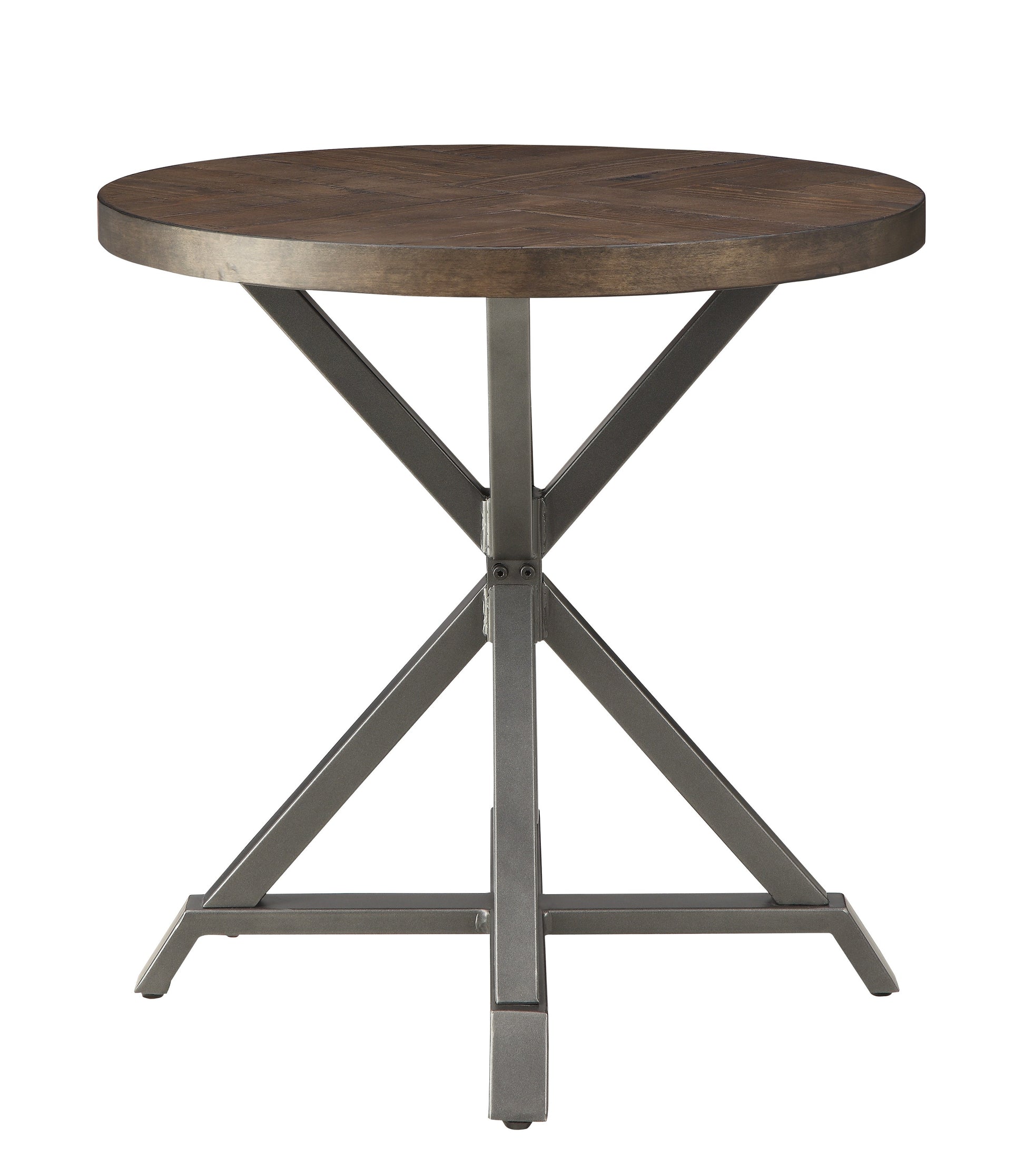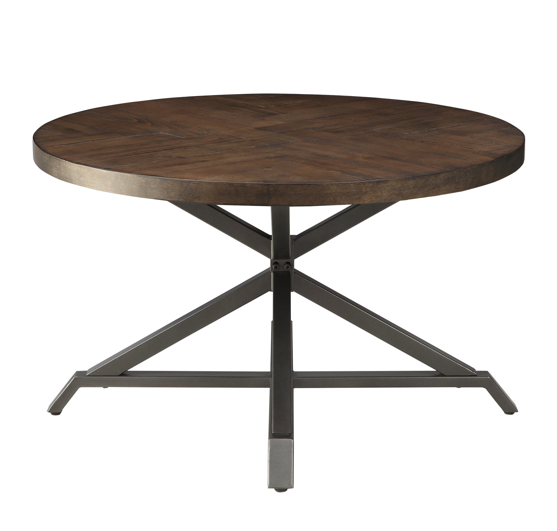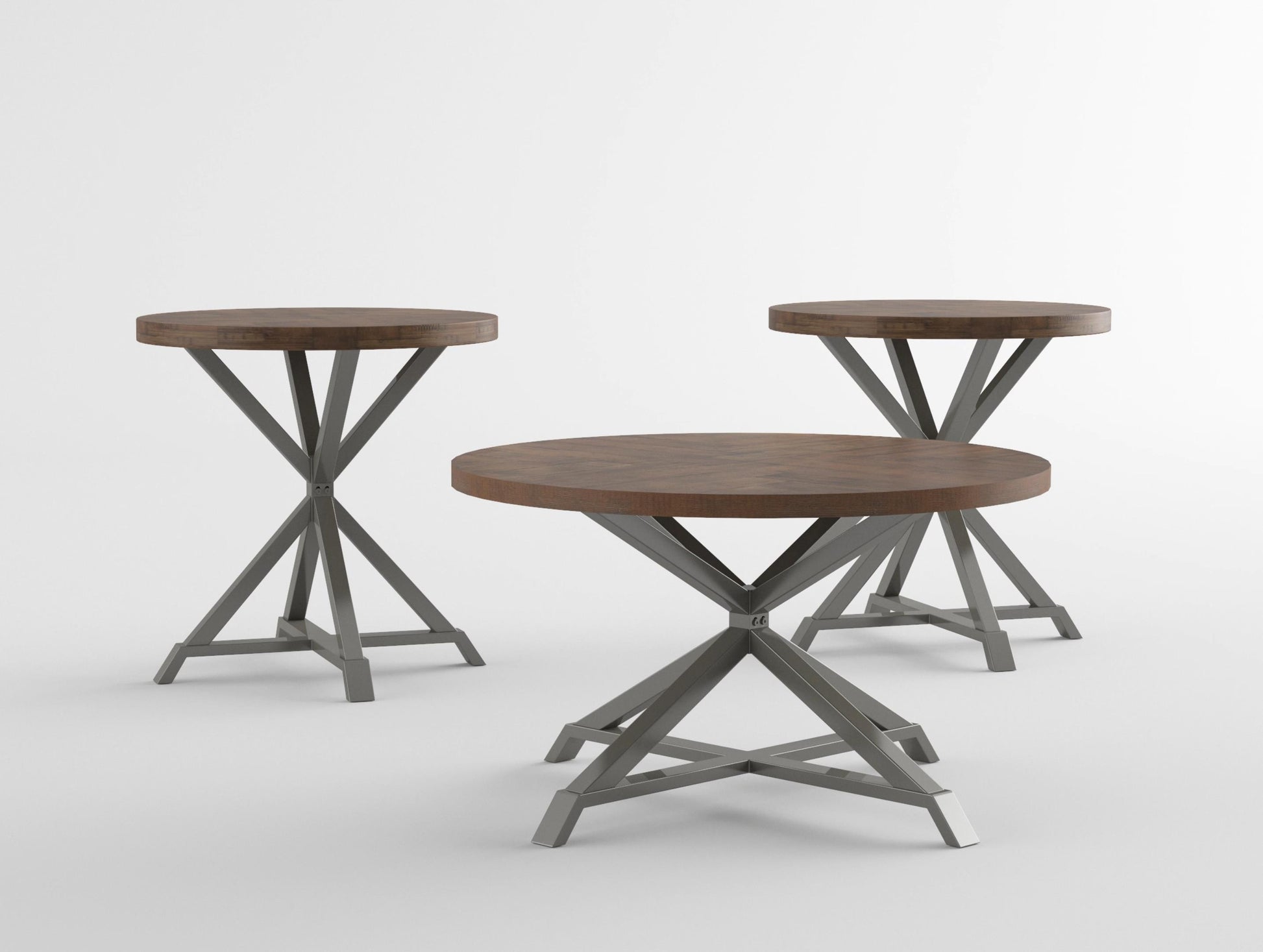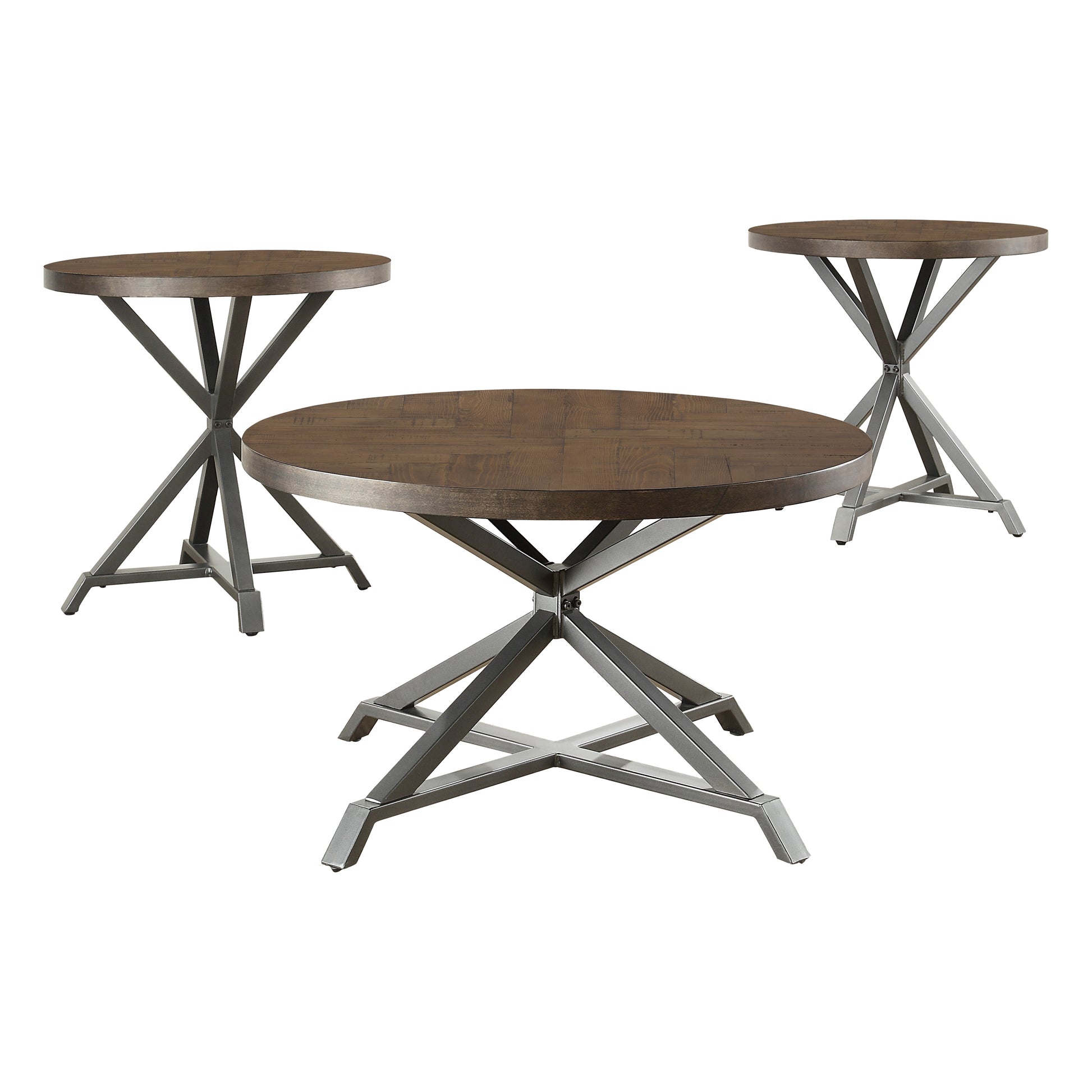 Wood and metal are combined to create the rustic industrial style of the Fideo Collection. Metal framing encircles the profile of the wood-topped cocktail and end tables of this 3-piece occasional collection. Pine veneer is featured in a herringbone pattern and has been given a burnished finish to complement the gray metal frame.