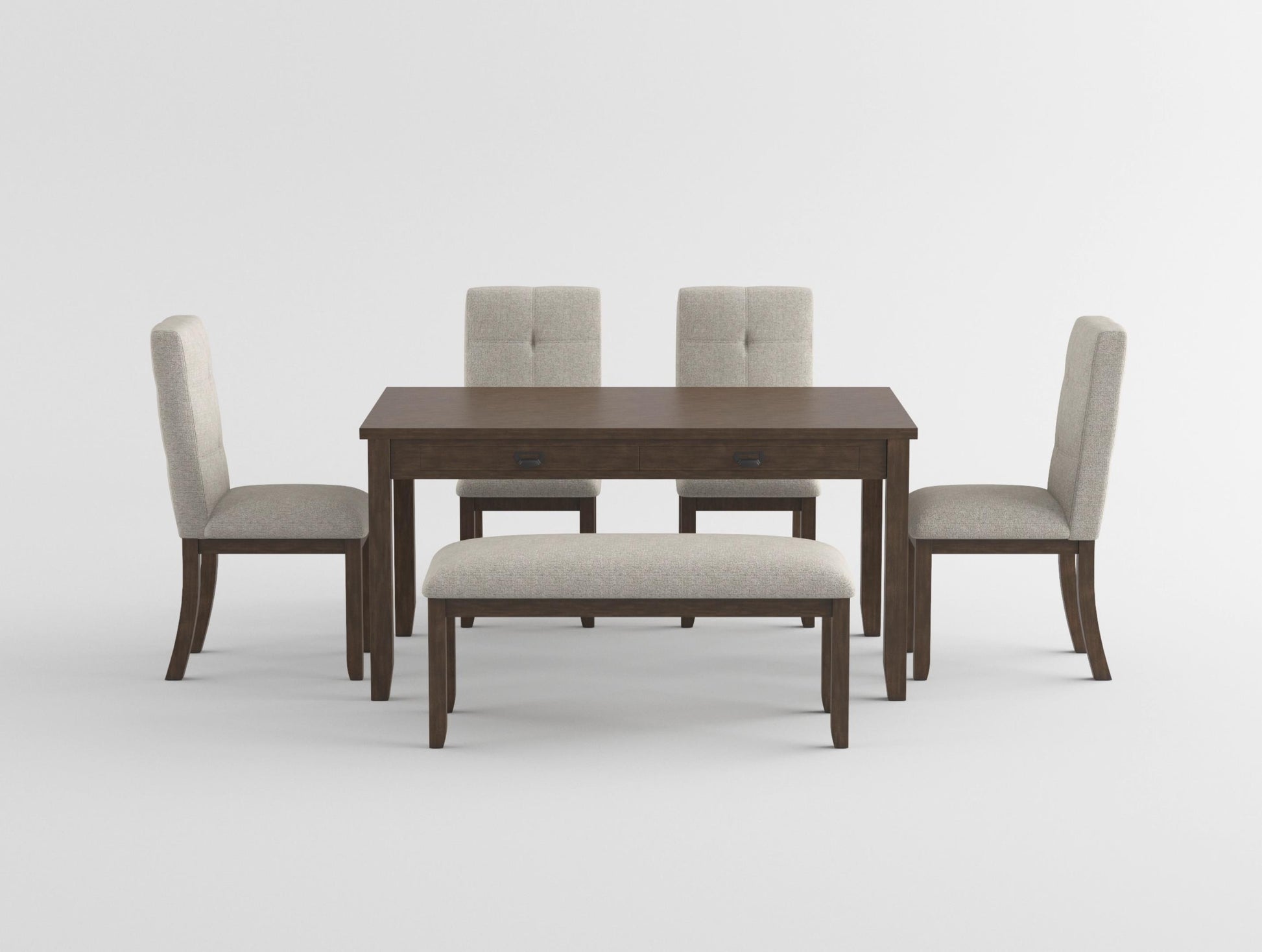 The transitionally styled table is uniquely accented by the modern lines of the accompanying chairs in the Binghampton Collection. Neutral tone fabric seats present complementing contrast to the cherry finish over cherry veneer of the casual dining group. Four functional drawers are located on the table apron allowing for convenient storage of tabletop accessories within quick reach. The available bench complements the design of the side chairs, providing an option for customizing your seating experience.