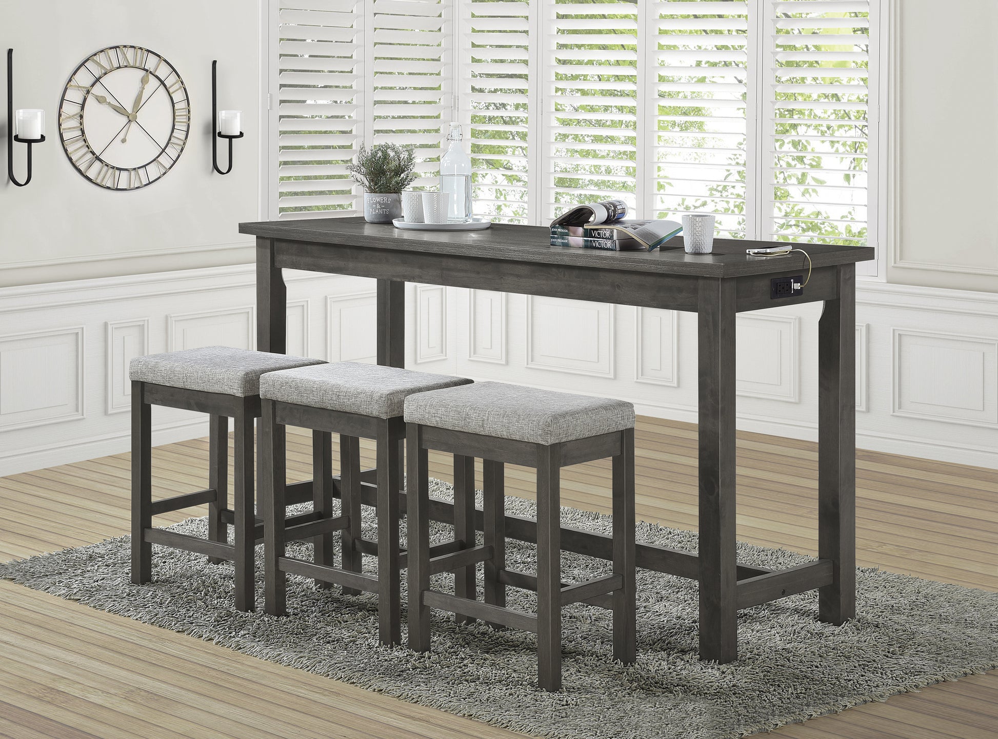 The elevated dining experience that the Connected Collection provides will fuel your device’s battery life while you fuel yourself. The convenience of built-in USB ports and A/C power turns your casual dining area into an efficient recharging station. The four-piece pack of the Connected Collection includes a counter height table and three barstools. A single drawer allows for discrete storage on the table’s side apron. As a neutral pallet for your decorative preference, the collection features a gray finish over ash veneer, with the neutral gray tone of the barstool’s seats providing subtle accent.