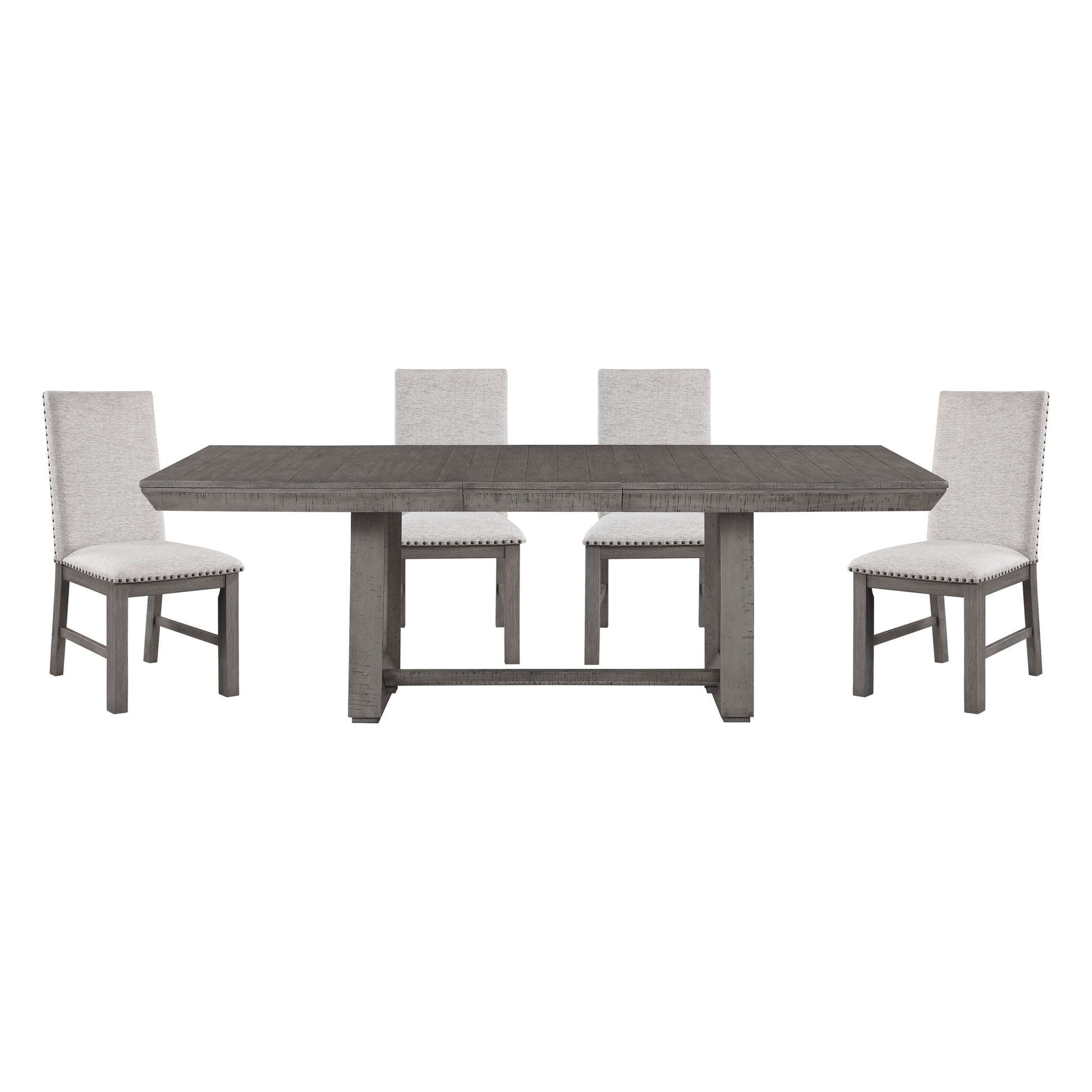At the intersection of modern and rustic design, the Gresham Collection brings you to a full stop. Clean lines are paired with the natural beauty of acacia veneer, while a gray finish lends neutral versatility to the décor of your casual dining room. The rustic look of the plank tabletop is interrupted by the modern lines of the table apron’s angled edge. Coordinating side chairs feature wood legs and gray fabric upholstered seats, with profile-defining nailhead trim. The open display shelving of the server further lends to the modern look of the collection while providing drawer storage for your tabletop décor.