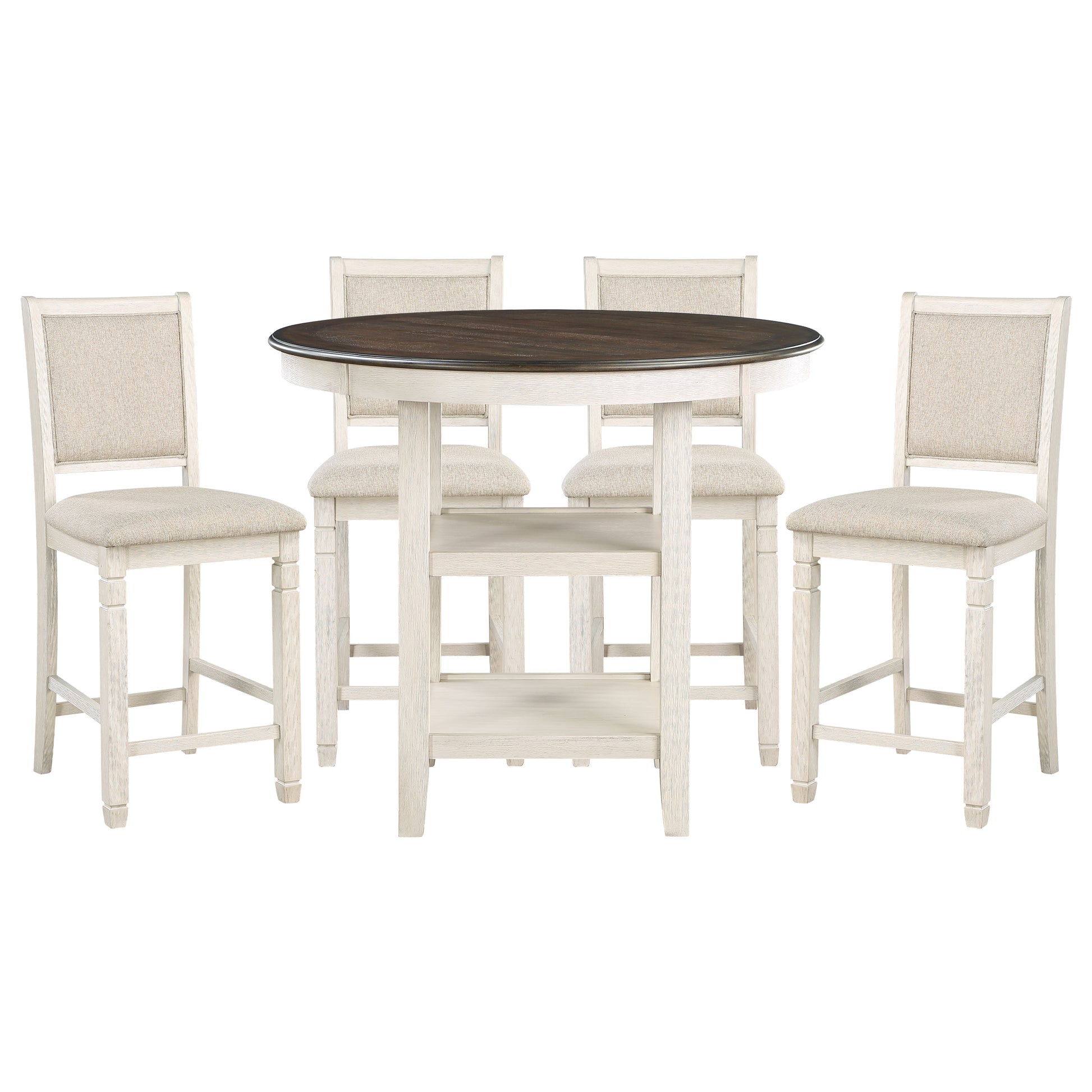 The transitional style of the Asher Collection creates a versatile platform to inspire your casual dining room décor. The round counter height table’s support base features a display shelf that allows for quick and open access to your tabletop accessories. The antique white finish over acacia veneer serves to highlight the wood’s grain while allowing for maximum versatility in decorative accenting. The coordinating wood-framed counter height chairs feature light brown fabric seats for complementing contrast.