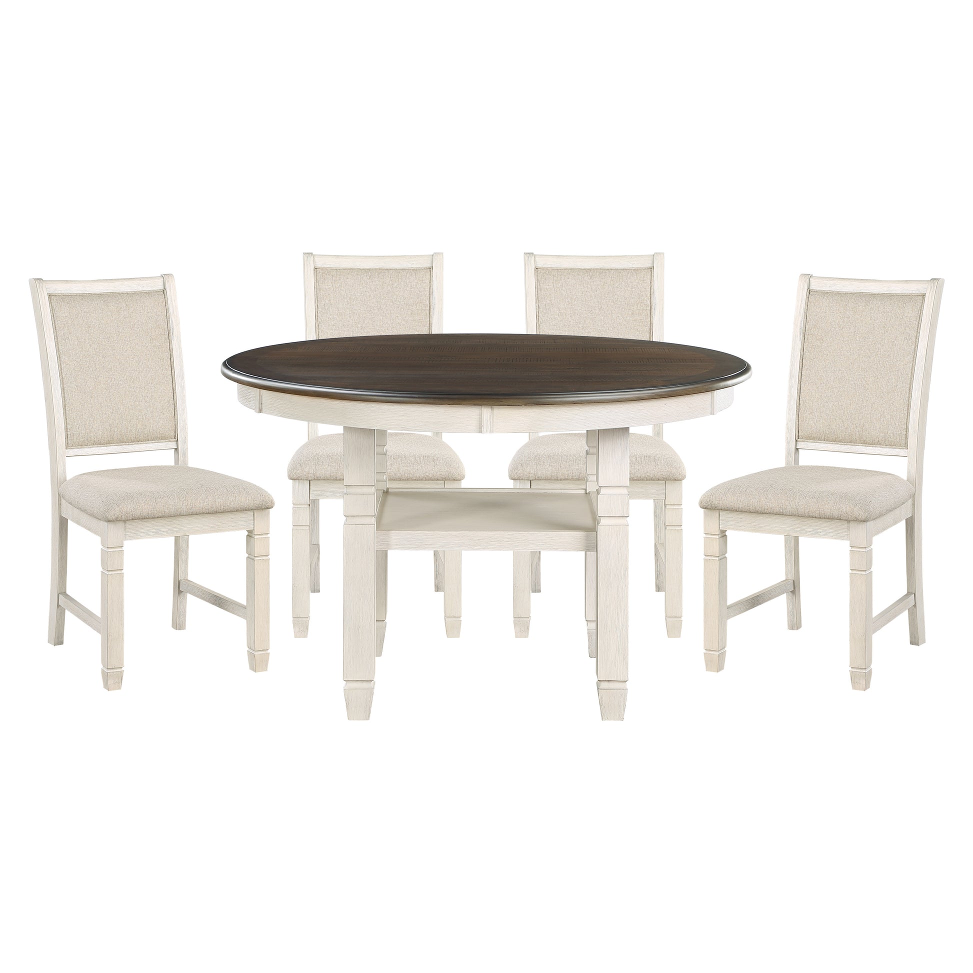 The transitional style of the Asher Collection creates a versatile platform to inspire your casual dining room décor. The round dining height table’s support base features a display shelf that allows for quick and open access to your tabletop accessories. The antique white finish over acacia veneer serves to highlight the wood’s grain while allowing for maximum versatility in decorative accenting. The coordinating wood-framed dining height chairs feature light brown fabric seats for complementing contrast.