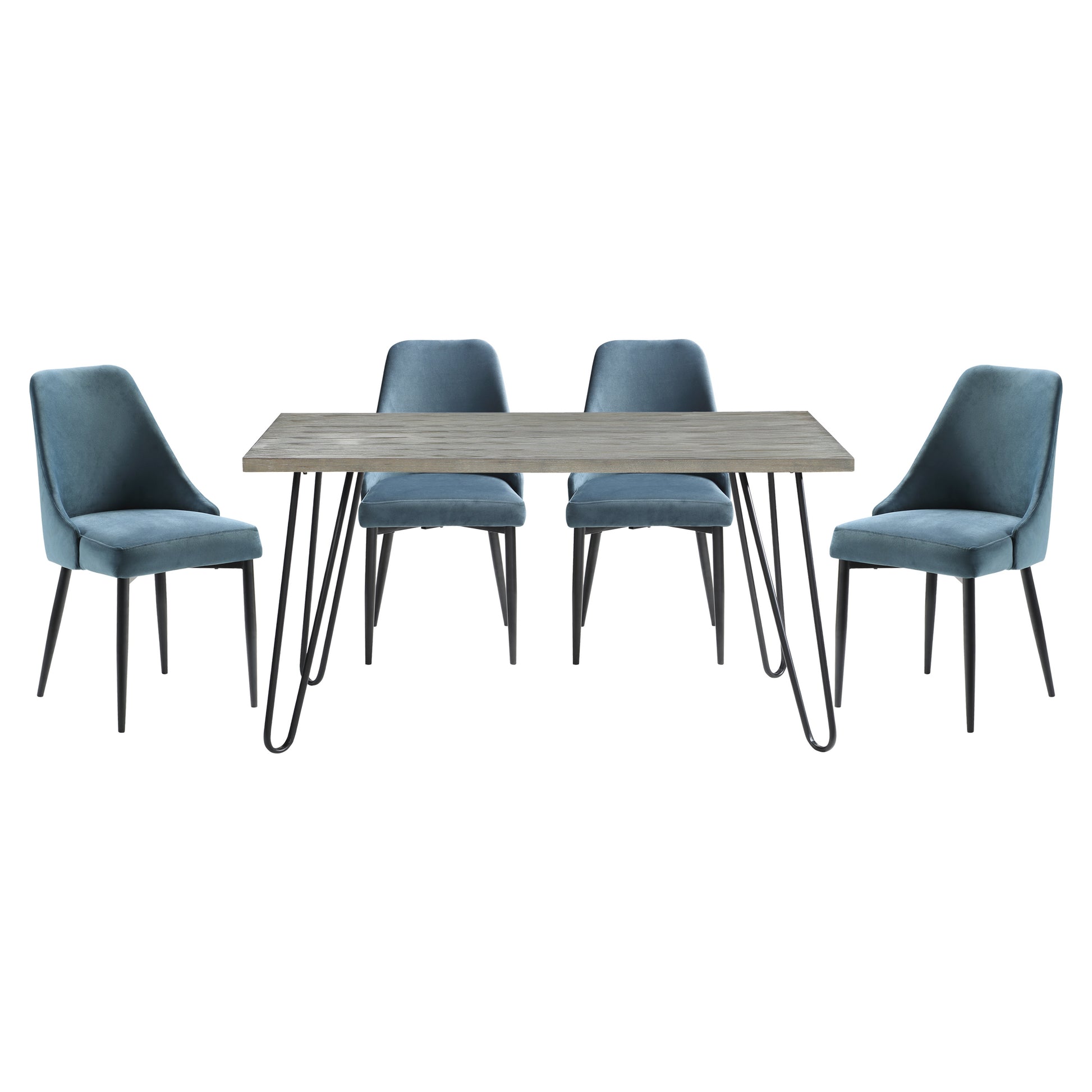 From its streamlined profile to the vibrant hues that contrast the table’s neutral finish, the modern design of the Keene Collection will blend perfectly with your dining room’s sleek aesthetic. A gray finish over oak veneer subtly highlights the distinct grain of the wood, while lending neutral contrast to the three available -blue, orange, and gray - velvet upholstered coverings of the accompanying side chairs. Black-finished hairpin legs support the table’s fixed top.