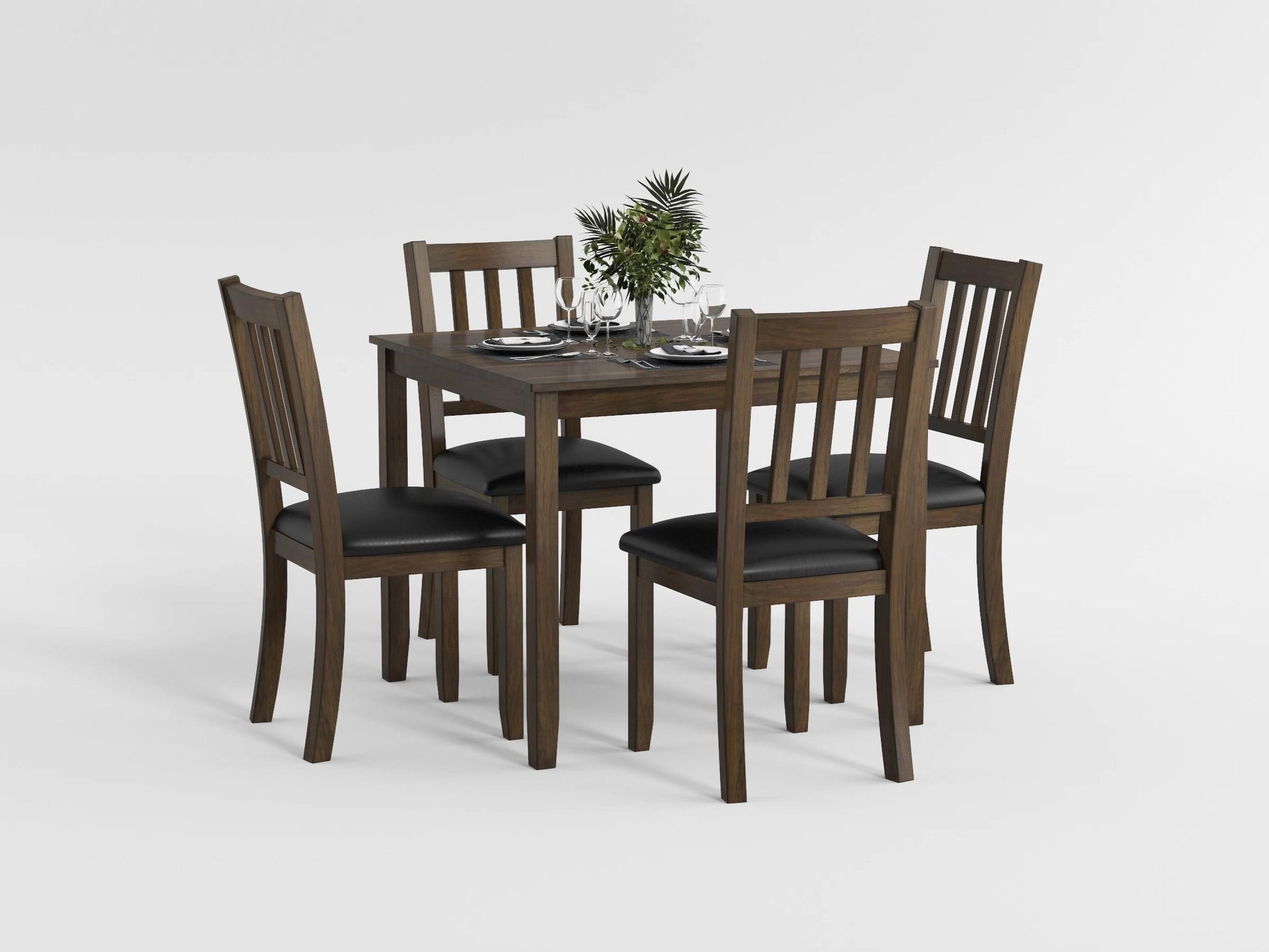 Scaled for your casual dining nook, the transitionally styled Faust Collection will provide the perfect complement to your home’s decor.?Vertical slat-back wood-framed chairs feature dark brown faux leather seating that pair with the coordinating table.?The five-piece dining collection is offered in a charcoal brown finish over birch veneer.