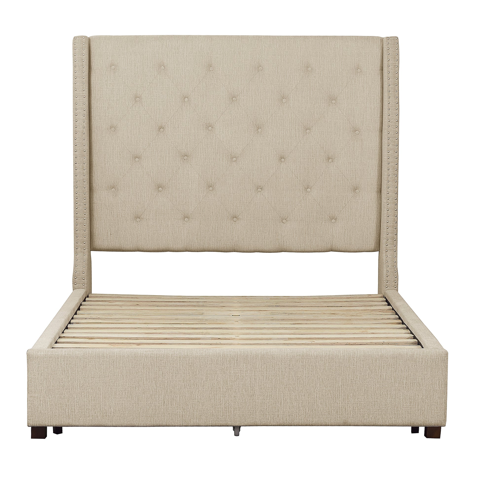 The stately profile of the Fairborn Collection will lend an air of understated elegance to your bedroom. The queen mansion headboard features nailhead accent and button tufting creating a modern traditional look that defines your personal style. Beige fabric covers the bed, providing neutral complement to your decorative bedding. Providing additional function to the bed is the footboard which extends to expose drawer space to meet your additional storage needs.
