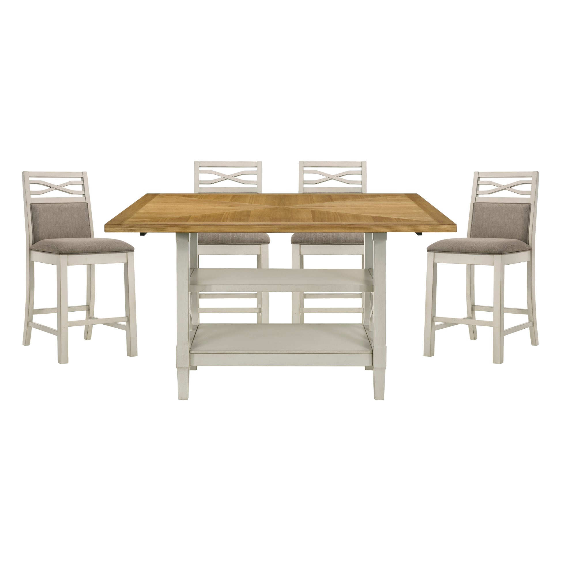 Your casual country inspired dining space presents its charming ambiance with the addition of the Maribelle Collection. The counter height table features a two-tone gray and light oak finish over ash veneer, the neutral tones a subtle complement to your tabletop décor. The available counter height chair, and bench, provide versatile options for your guest’s seated experience, with the gray finish and khaki fabric upholstered seats providing coordinating complement to the table. An open display table base creates additional storage space within your casual dining room and ease of access to your tabletop accessories.