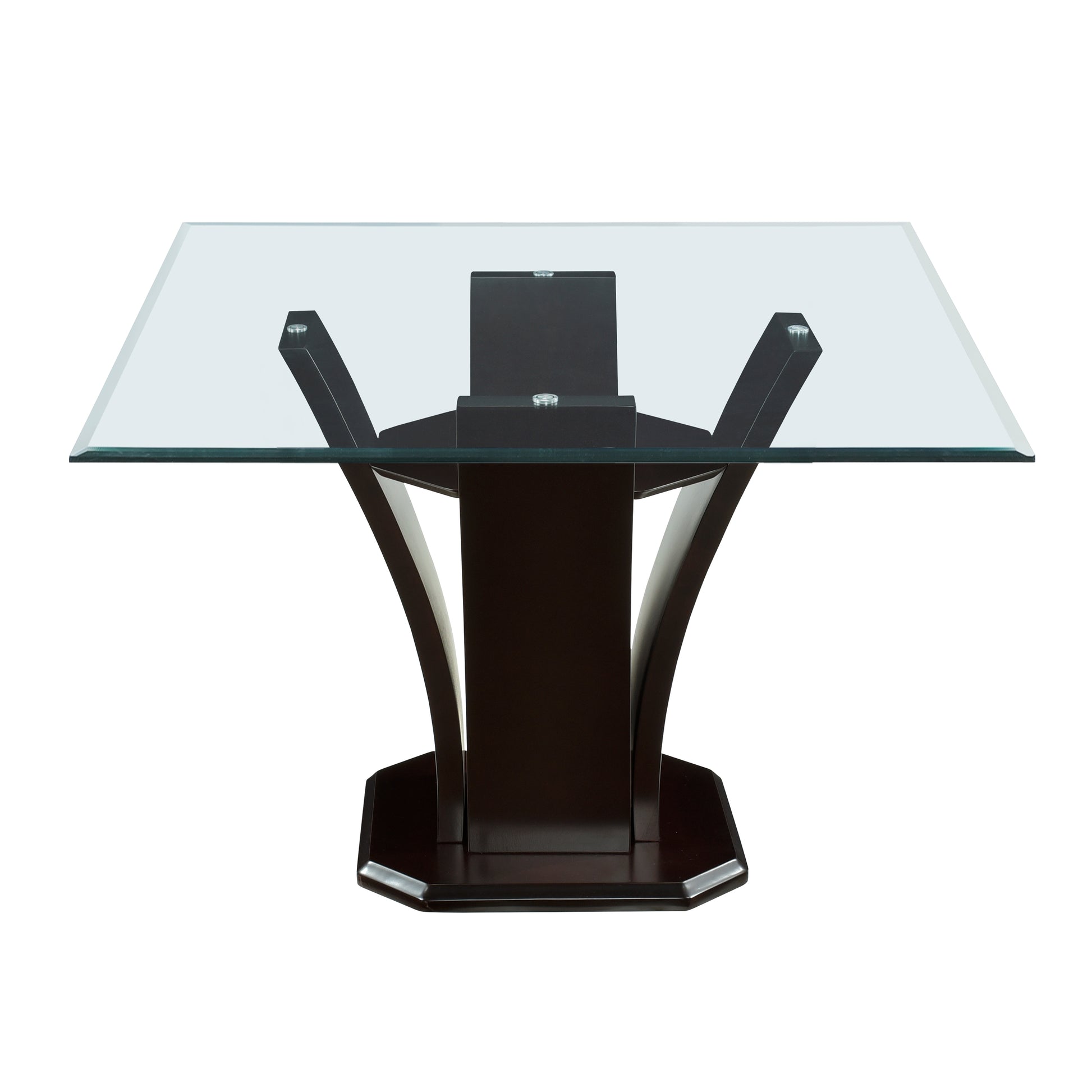 Daisy Collection combines superb visual appearance and fine quality that you need in your dining area.?Three distinct elegant flared tulip bases support beveled glass tabletops on the square traditional dining height tables.?Additional offering is the trestle table with black glass insert.?Dining height chairs feature clean lines and sleek curves; available in both white faux leather and dark brown faux leather.?The set is constructed of hardwood solids and veneers in a refreshing espresso finish.