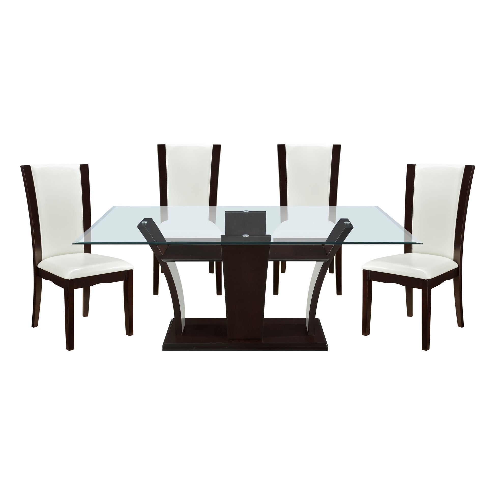 Daisy Collection combines superb visual appearance and fine quality that you need in your dining area.?Three distinct elegant flared tulip bases support beveled glass tabletops on the rectangular traditional dining height table. Dining height chairs feature clean lines and sleek curves; available in both white faux leather and dark brown faux leather.?The set is constructed of hardwood solids and veneers in a refreshing espresso finish.