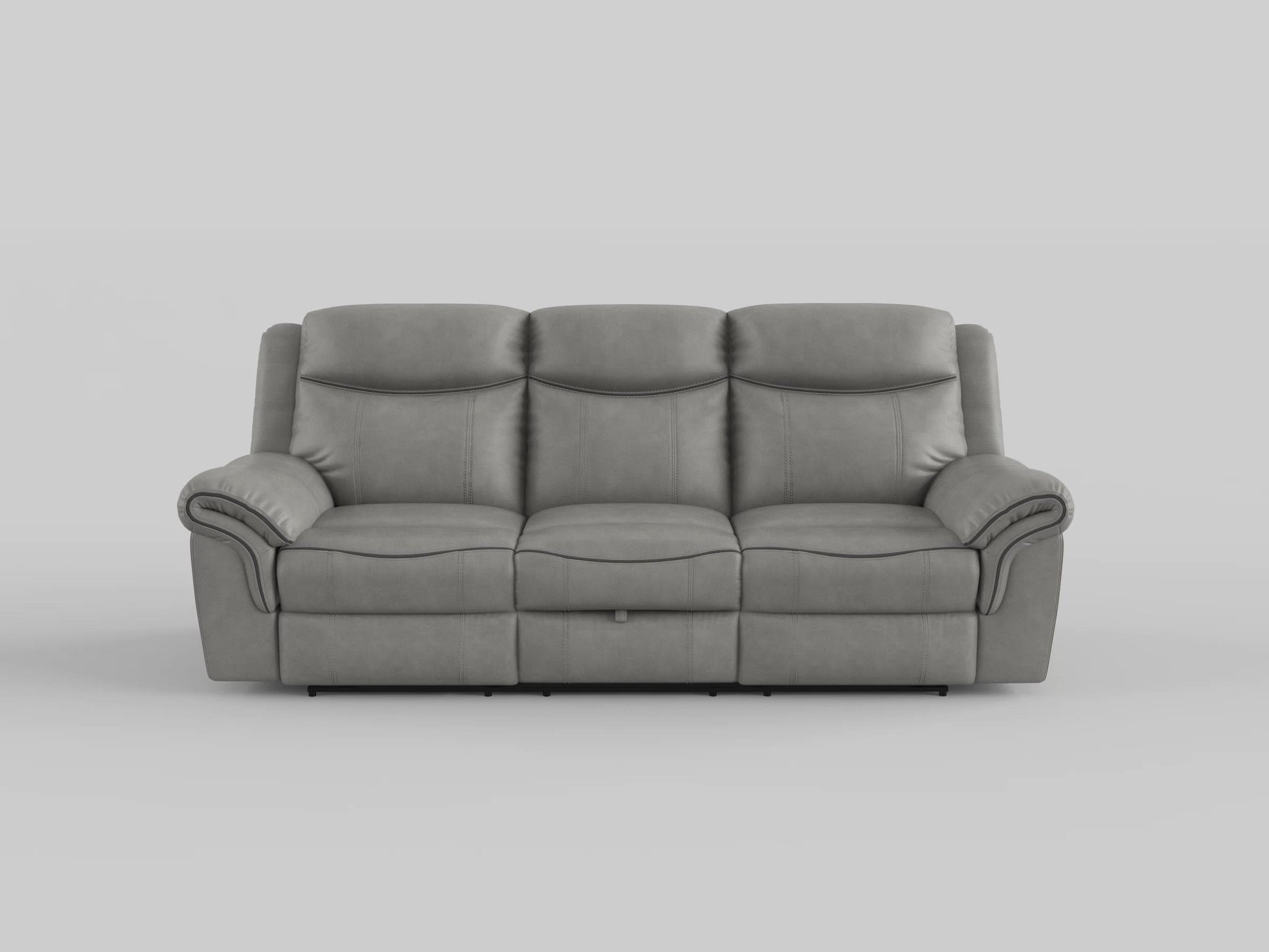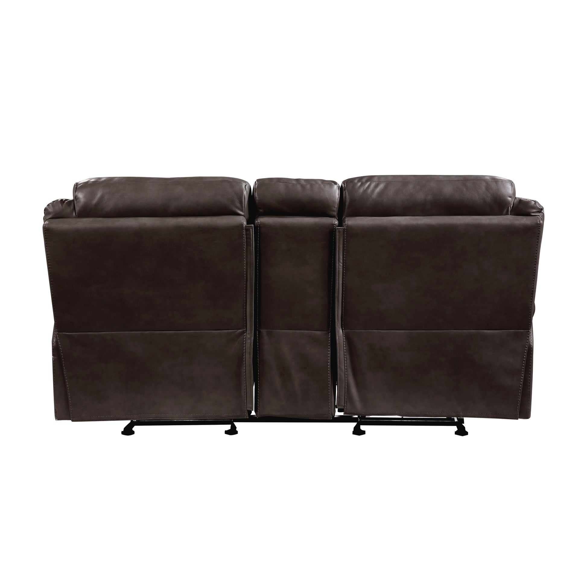 With amply appointed offerings that create not only a comfortable seating experience but a functional one as well, the Aram Collection will be a welcome addition to your home. Dark brown breathable faux leather covering for comfort and style that will blend effortlessly with your transitional decorative preference. Manual motion mechanisms operate with the pull of a side-mounted tab, that once engaged, take you from seated to reclined in an easy motion. Each piece in the collection has an individual function allowing for convenience and comfort. The sofa features dual reclining ends and a drop down center seat back with cup-holders, electric receptacles, USB port and tabletop space, the dual glider reclining ends of the love seat flank a center mounted console with storage, electric receptacles and cup-holders, and the reclining chair features a glider mechanism that allows for easy back and forth motion.