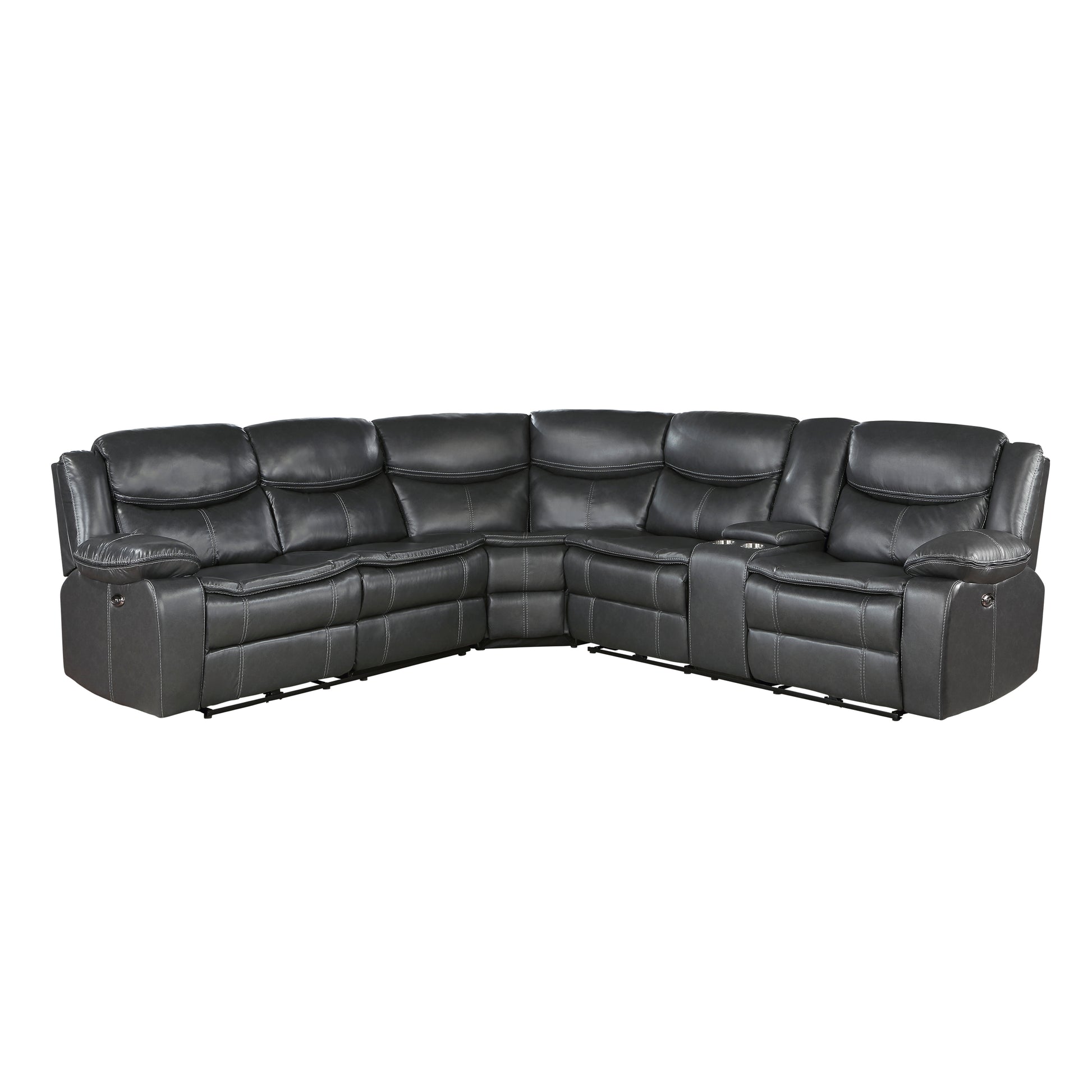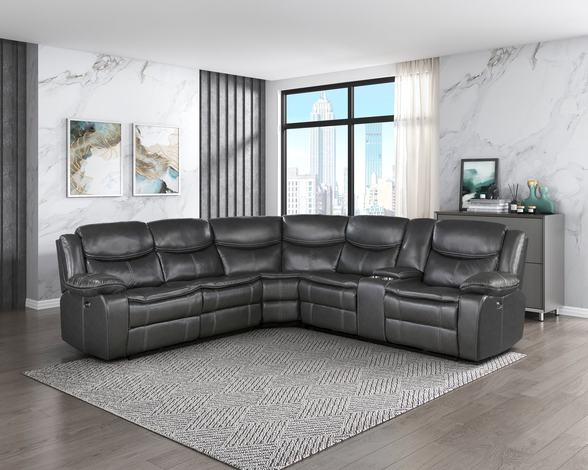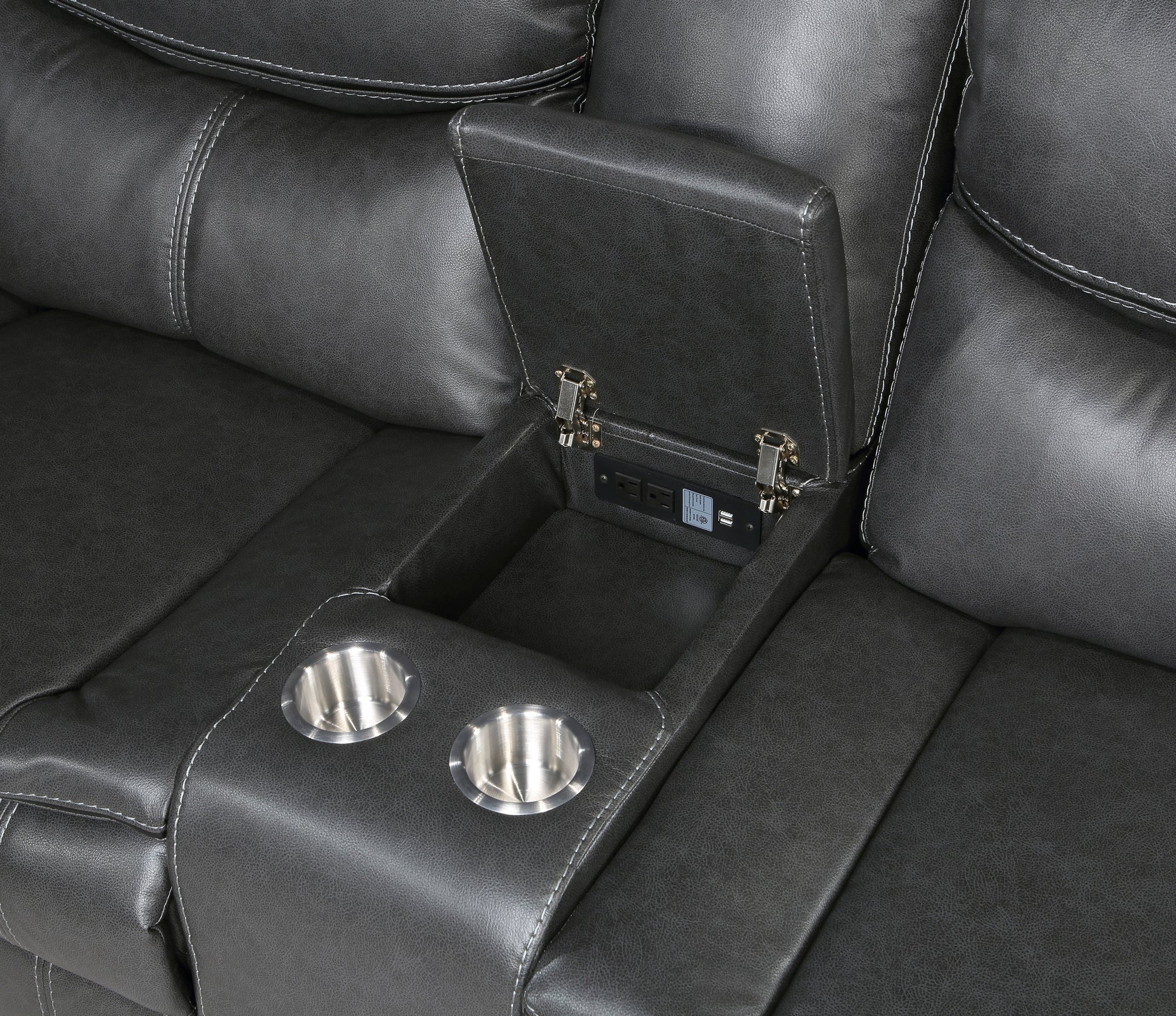 Designed to provide ample seating in your casual living room, the Fargo Collection utilizes a blend of comfort and function to create a perfect spot to chill out. The center seating unit is flanked by the dual power reclining seats of the right-side unit - its center console featuring cupholders, hidden storage, USB ports, and receptacles – and the left-side love seat with an end power recliner and stationary seat. Dark gray breathable faux leather covers the plush seating of the sectional.