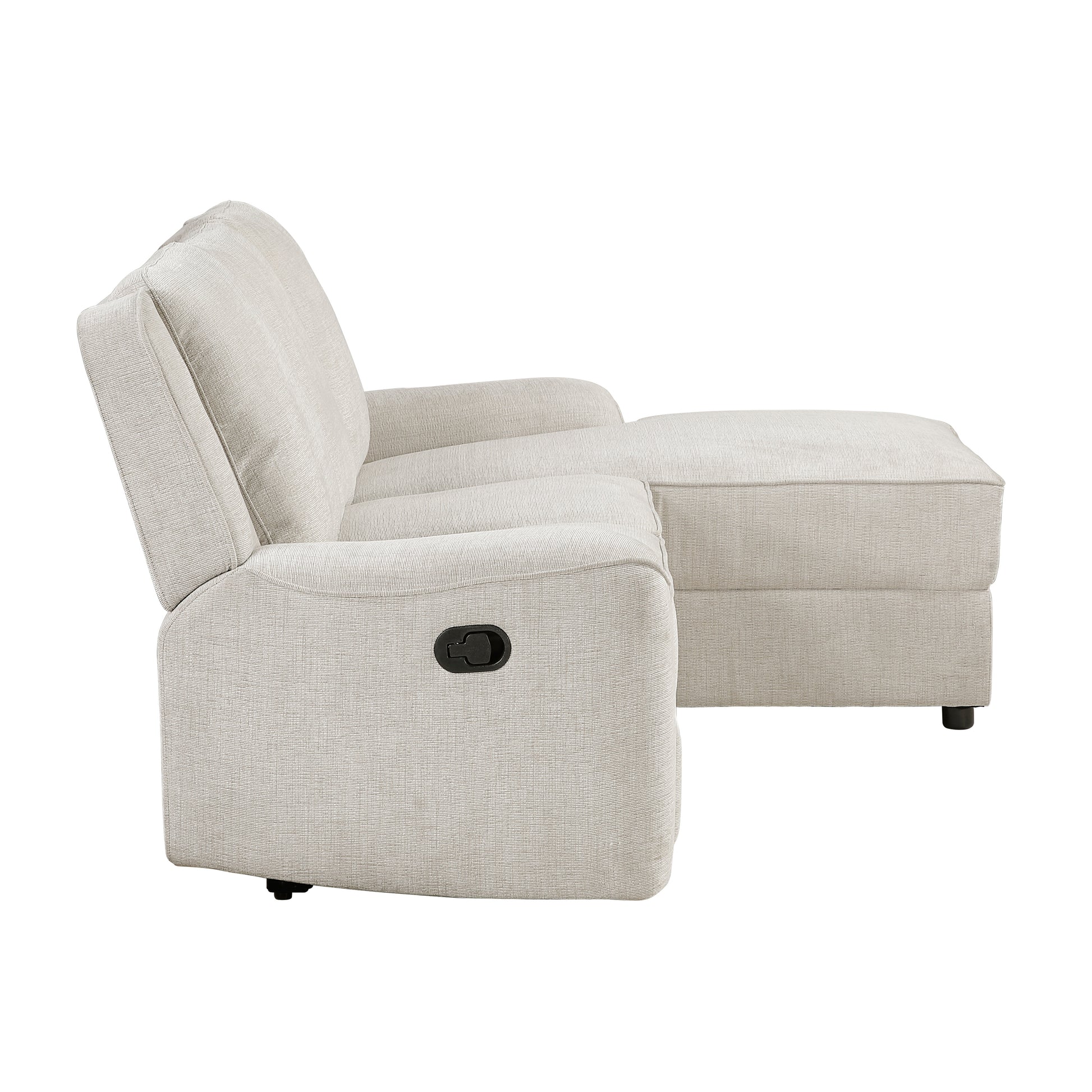 Maximize comfort and functionality in your living space with this ivory chenille reclining loveseat and chaise sectional. This two-piece set includes a left-side reclining loveseat with a drop-down console featuring cup holders, and a right-side reclining chaise, offering ample seating and relaxation options. Crafted with a sturdy solid wood and plywood frame, foam padding over pocket coils, and soft chenille fabric upholstery, this sectional provides both durability and exceptional comfort. The tab pull reclining motion allows for effortless relaxation. With two recliners and a 300lb weight capacity per seat (600lb total), this sectional is perfect for family movie nights or unwinding after a long day.