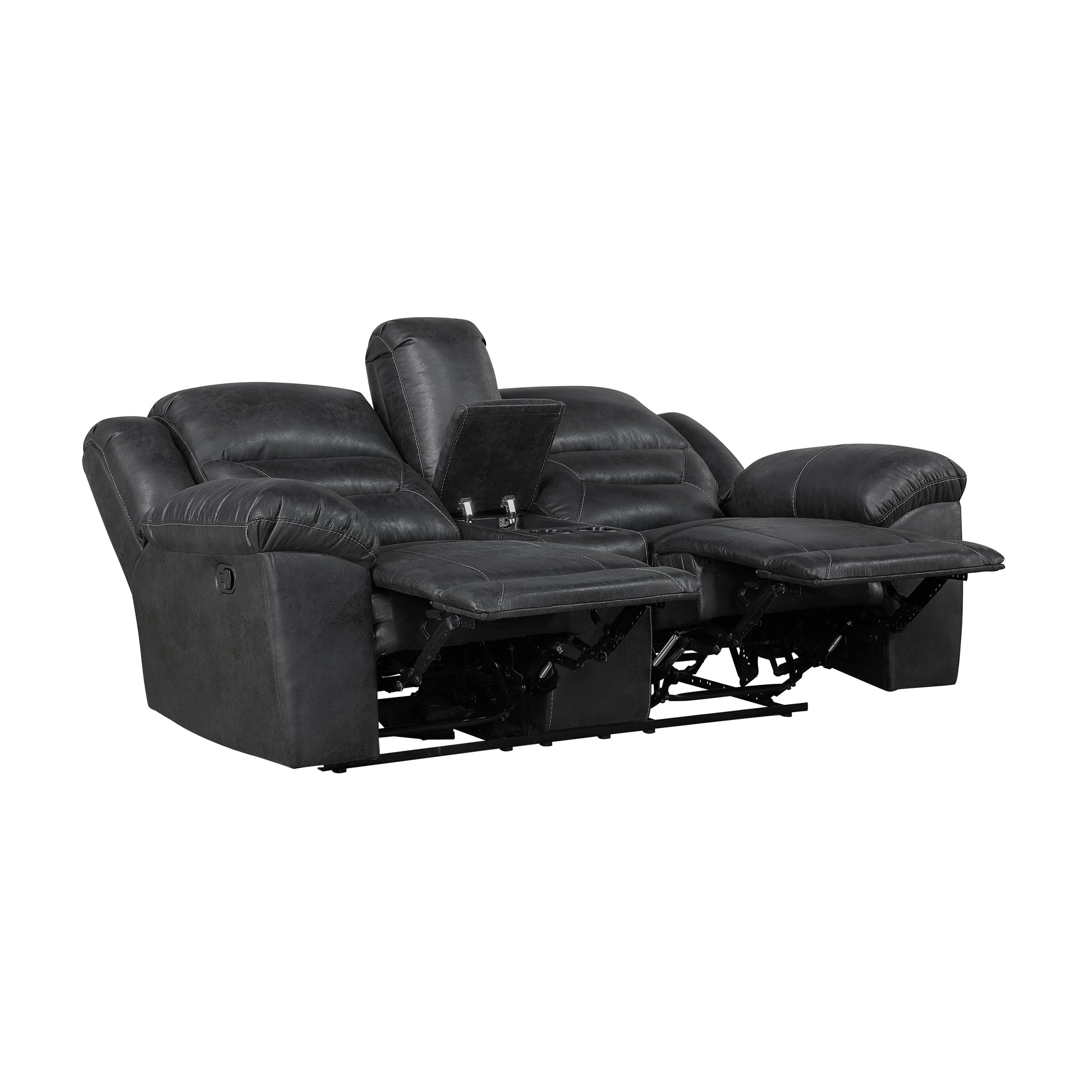 The Hazen Collection’s versatile style and functional design will be an inviting addition to your home’s living room. Dual end recliners are featured on love seat, with its center console providing secure storage of beverages via the two cupholders and a lift-top storage compartment. The reclining mechanisms of the love seat are engaged with a pull of their side mounted tabs, taking you from seated to prone in an easy motion. Black polished microfiber upholstery covers the plush pillow-top arms and contoured seating, creating a perfect combination ready for relaxation.
