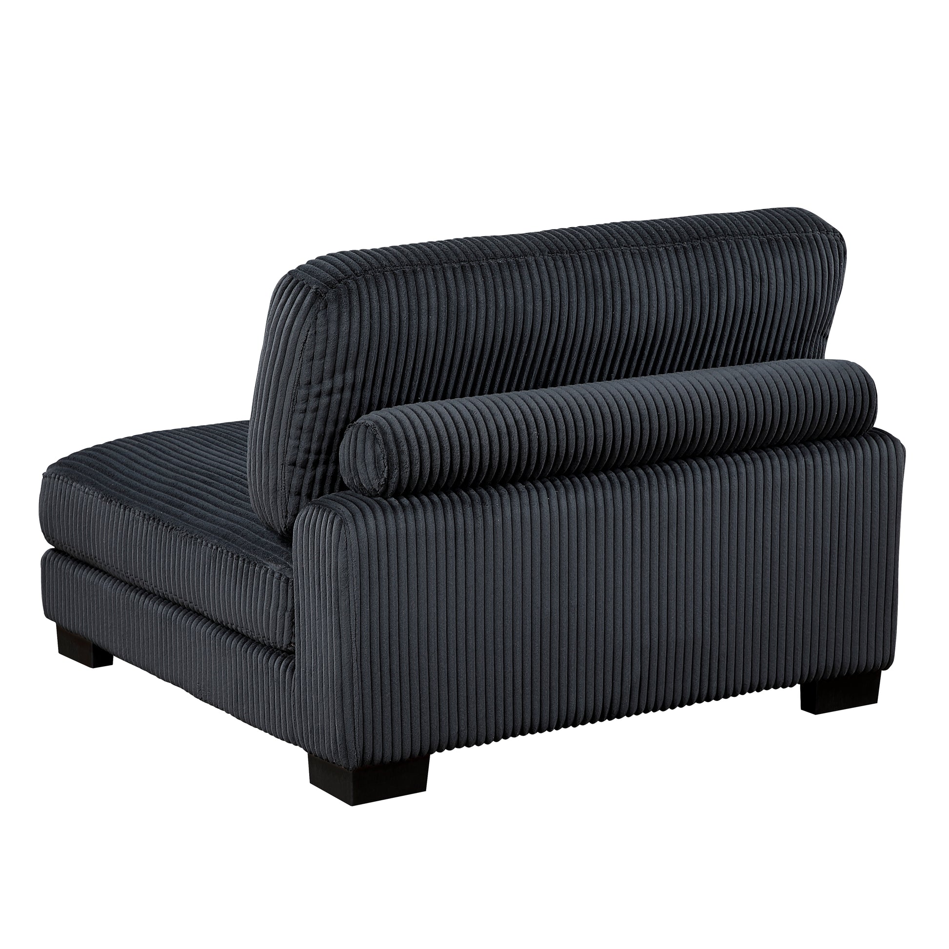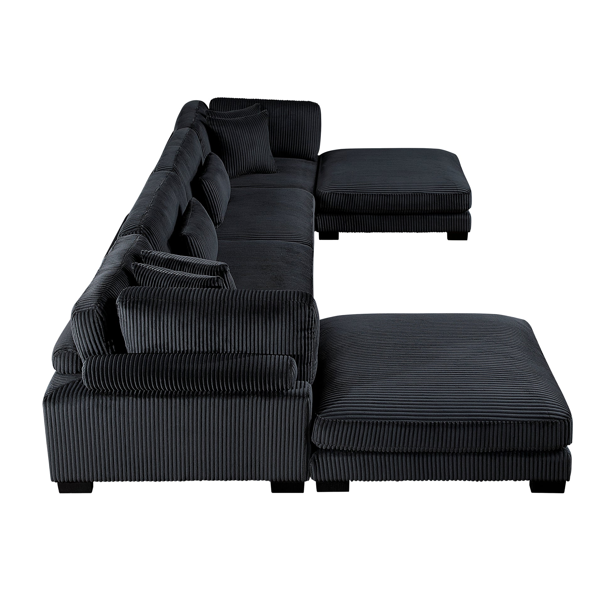 Configurable to your available space, the Traverse Collection allows for the addition and detachment of pieces for a customized seating experience. The 6-piece sectional configuration consists of two corner units paired with two armless chairs, and two ottoman. The plush black corduroy fabric upholstery creates a plush expanse for a soft touch experience.