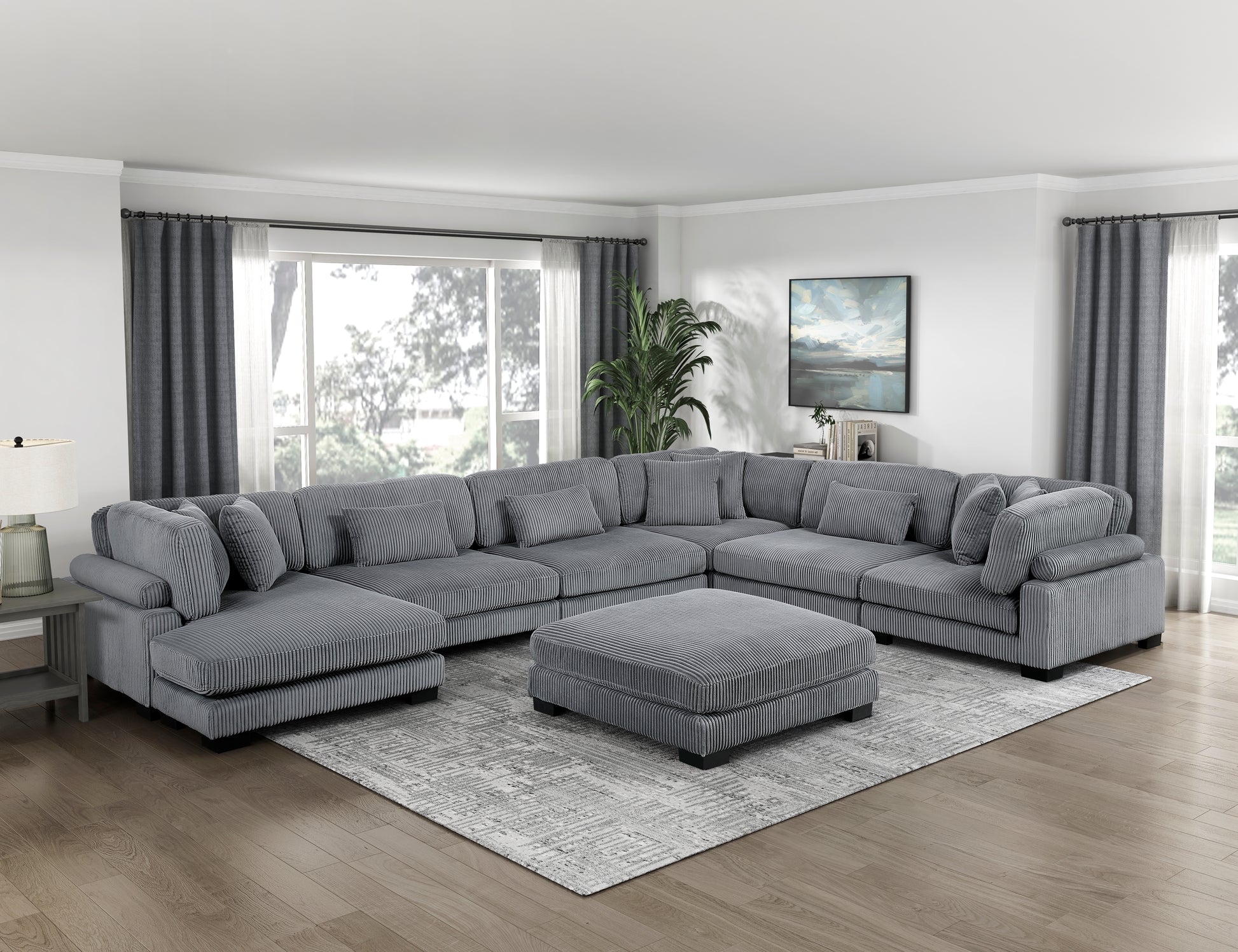 Configurable to your available space, the Traverse Collection allows for the addition and detachment of pieces for a customized seating experience. The gray corduroy fabric upholstery creates a plush expanse for a soft touch experience. The versatility in placement of the ottoman is left to your creative vision, using it as a stand-alone unit or part of a larger configuration.