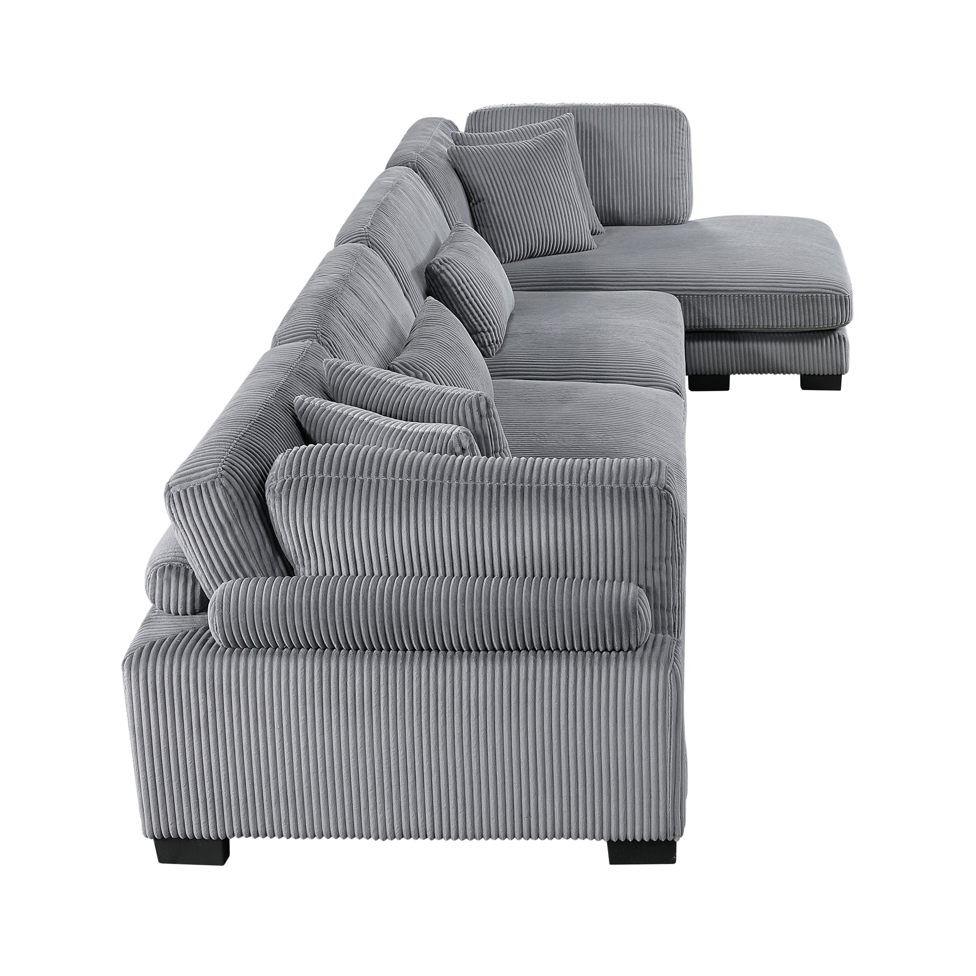Configurable to your available space, the Traverse Collection allows for the addition and detachment of pieces for a customized seating experience. The 4-piece sectional configuration consists of one corner unit paired with two armless chairs, and a chaise. The gray corduroy fabric upholstery creates a plush expanse for a soft touch experience.
