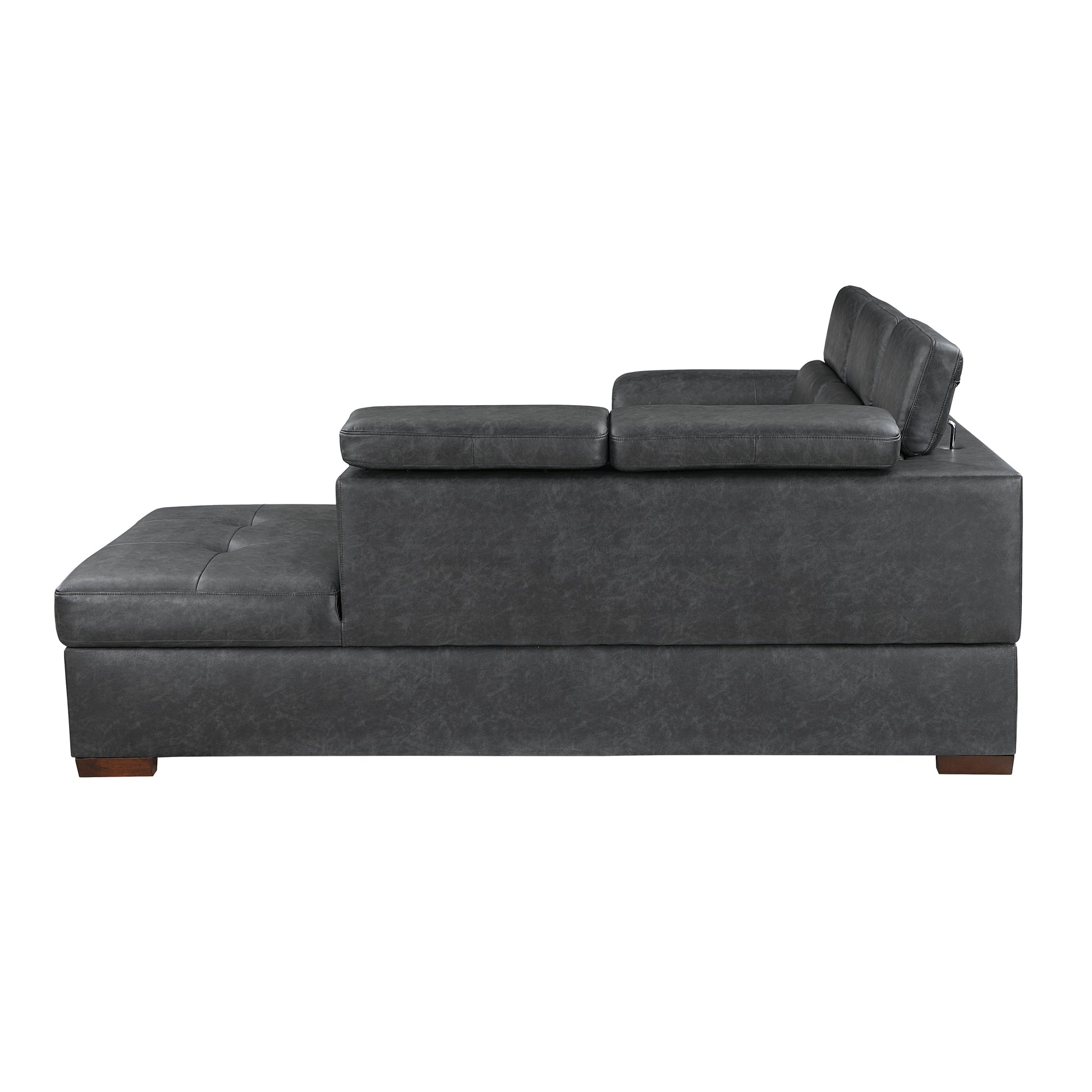 Functional beyond traditional seating arrangements, the Barre Collection provides seating, sleep space, and storage, all welcome additions to your home. The right-side open-ended chaise provides hidden storage for your blankets and pillows, while the left-side seating unit features a pull-out bed that allows for additional sleep space within your casual living, and the adjustable headrests further your comfort. Complementing your home’s modern décor is the gray breathable faux leather upholstery that covers the sectional.