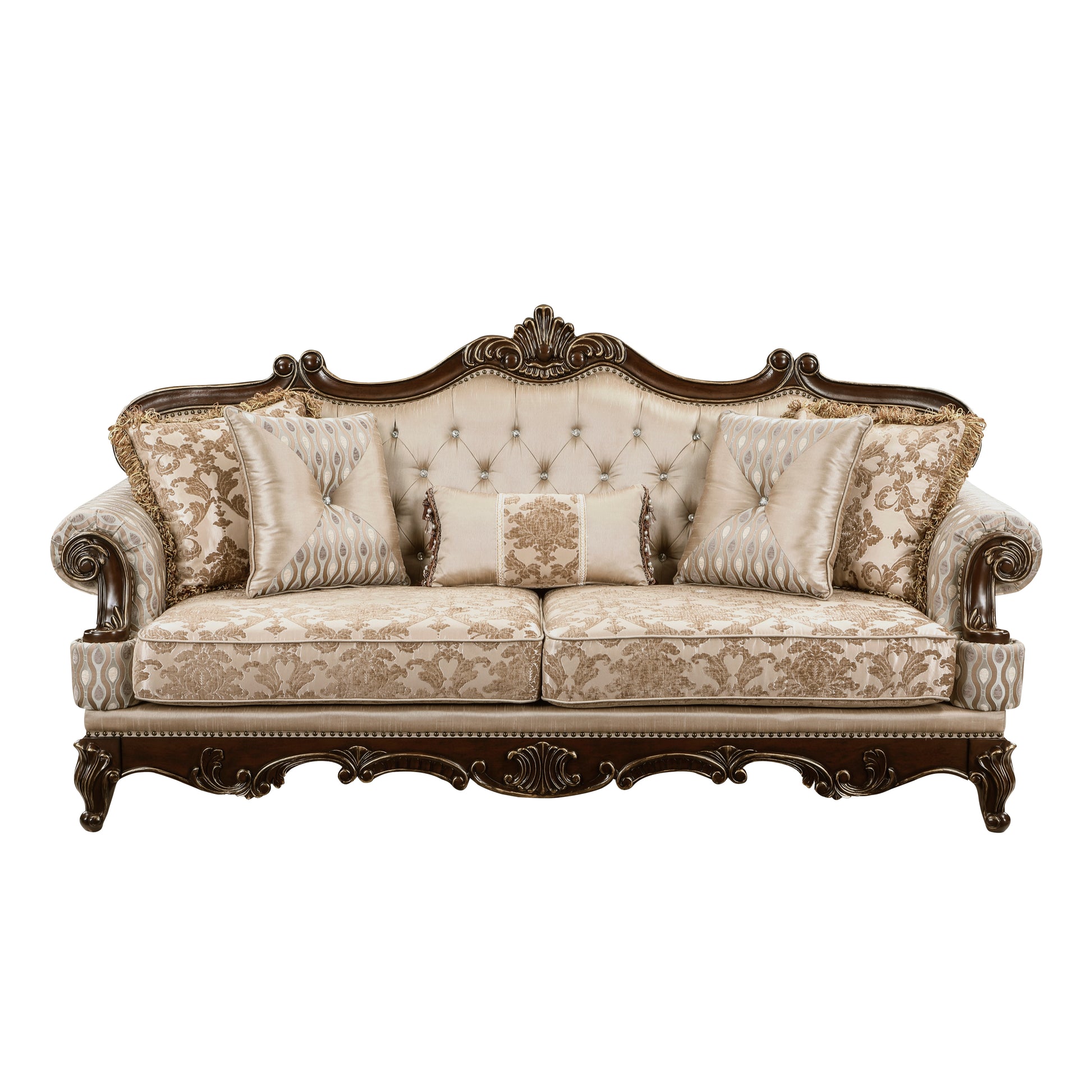 An elegant combination of traditional elements is paired to create the timeless look of the Balthasar Collection. The eye-catching design of the base and top rail of the sofa features a cherry finish with gold tipping, the elegant detail a perfect pairing to the complementing contrast of the patterned brown chenille fabric upholstery. Faux crystal-tufted, and trim detailed, the sofa also features five coordinating toss pillows. Furthering the traditional aesthetic are the round arms and contoured arm fronts.