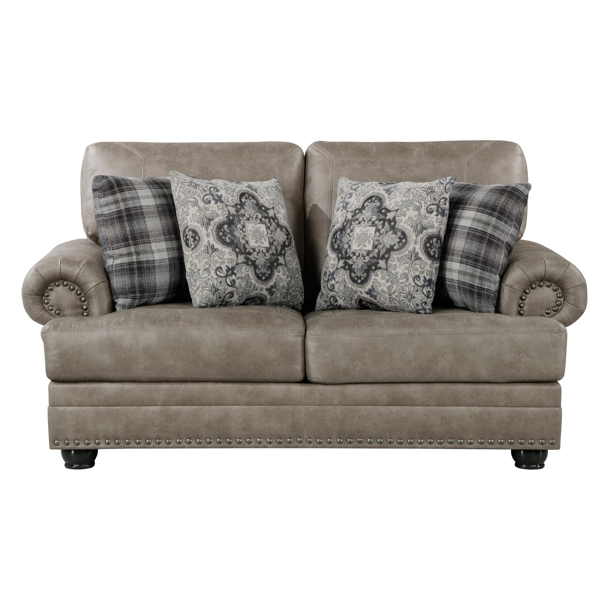 With a refined look that is steeped in traditional design, the Franklin Collection provides a timeless elegance to your living room. Mushroom-hued polished microfiber covers the frame of the collection while traditional rolled arms, and nailhead trim provide classic detail to profile of the seating group. Contrasting toss pillows solidify the look, the floral and plaid designs an elegant pairing to complement your space.