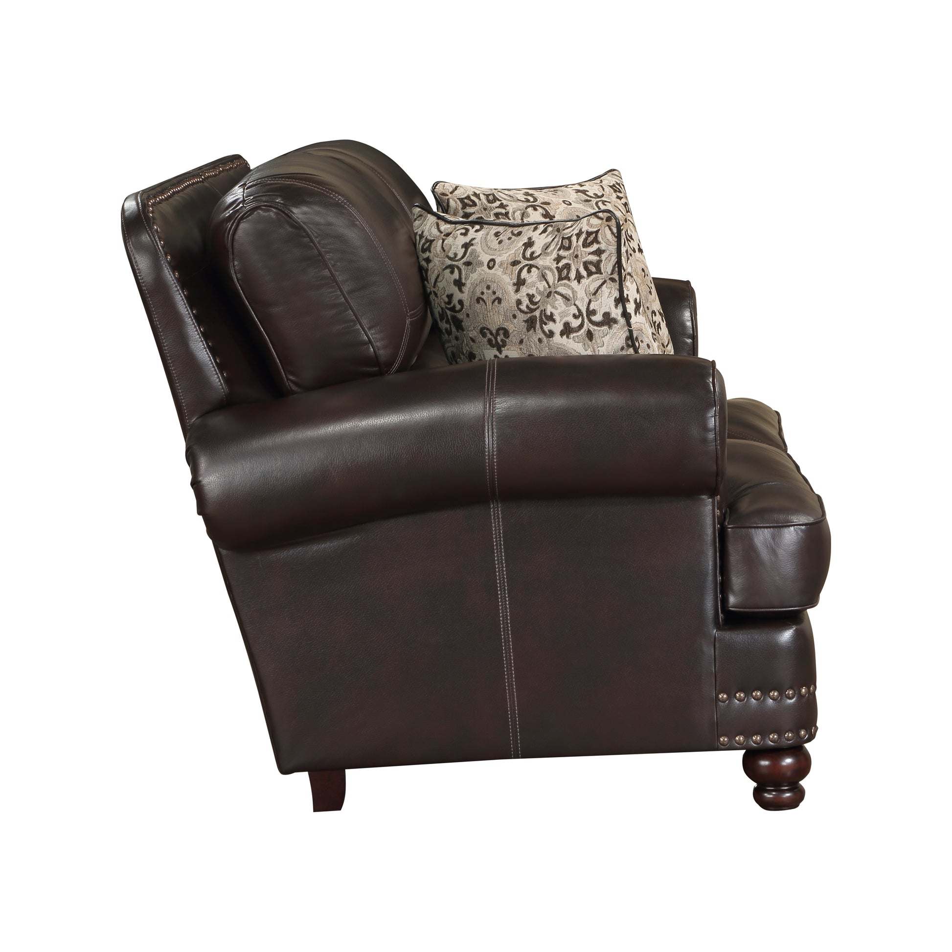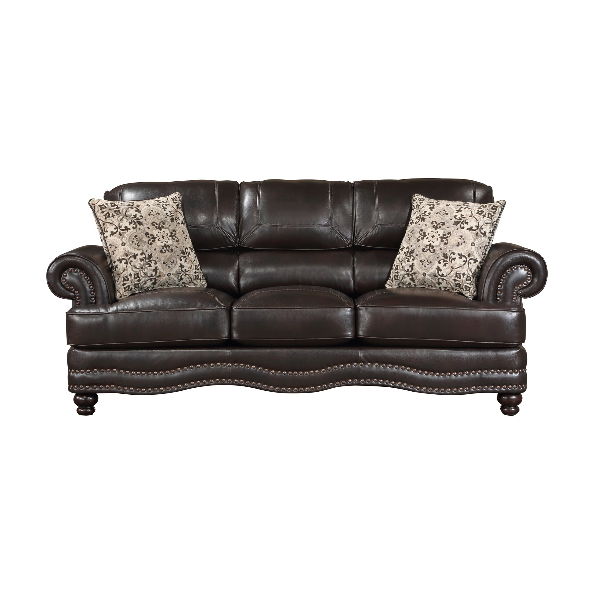 With accenting that pairs flared rolled arms, plush seating, nailhead trim and serpentine lines, the design of the Milford Collection results in an elegant seating option for your home’s traditional living room. Brown breathable faux leather upholstery covers the seating group while contrast toss pillows provide classic detail to the timeless aesthetic.