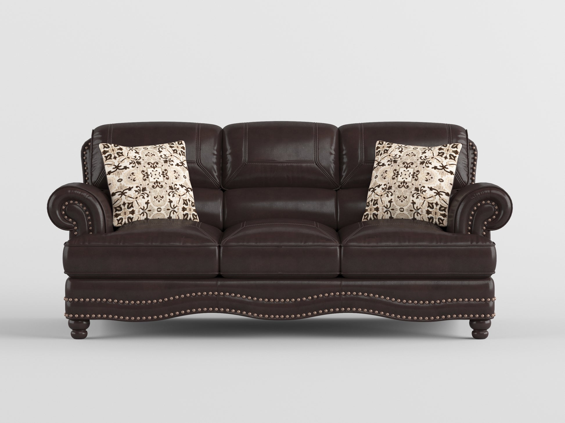 With accenting that pairs flared rolled arms, plush seating, nailhead trim and serpentine lines, the design of the Milford Collection results in an elegant seating option for your home’s traditional living room. Brown breathable faux leather upholstery covers the sofa while contrast toss pillows provide classic detail to the timeless aesthetic.