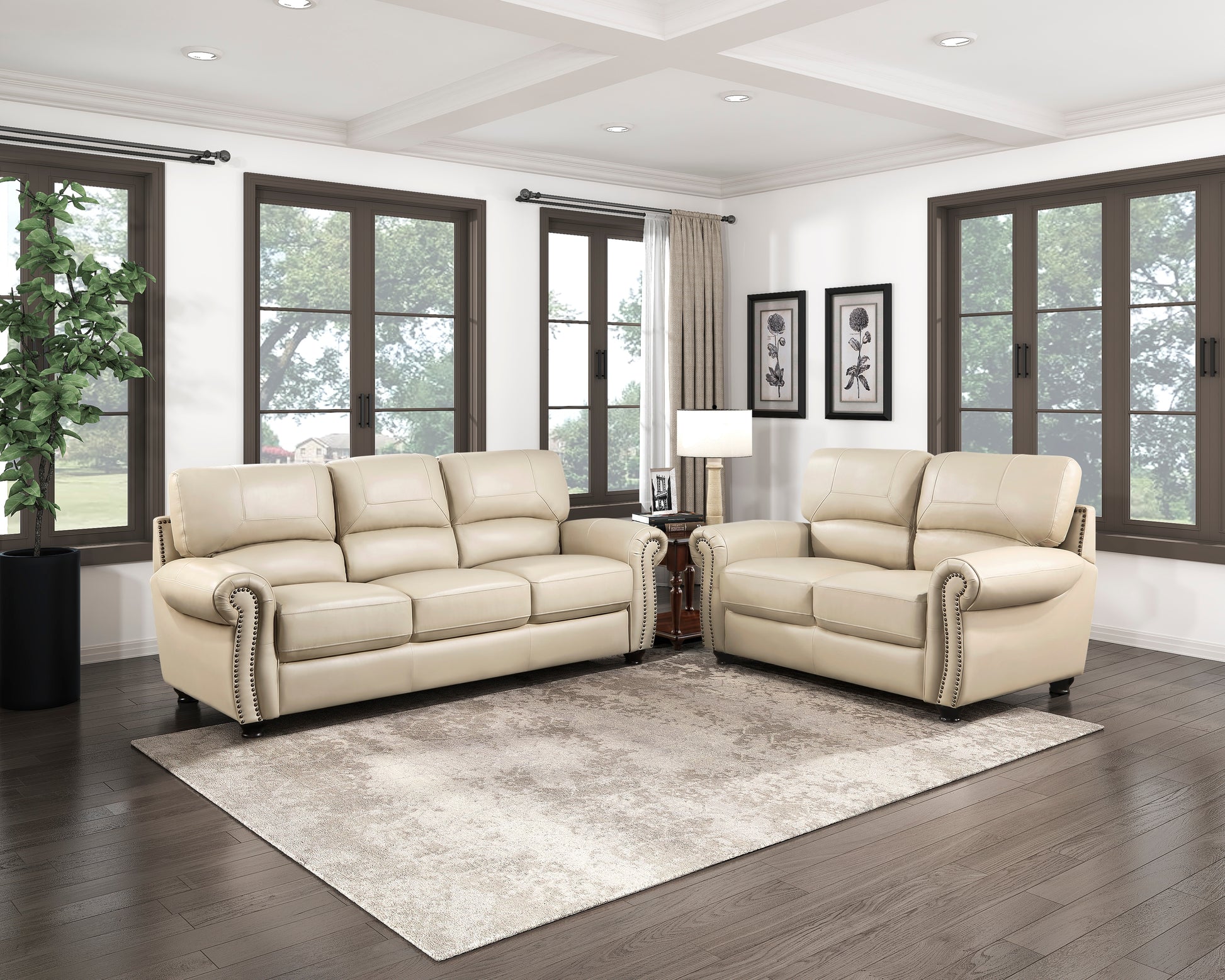 Traditional design and classic accents are paired to create the timeless look of the Foxborough Collection. Cream top-grain leather covers the plush seating of the sofa everywhere the hand touches – with faux leather match covering the remaining areas. The profile of the seating arrangement is defined by elegantly rolled arms, plush seatbacks, and nailhead trim.