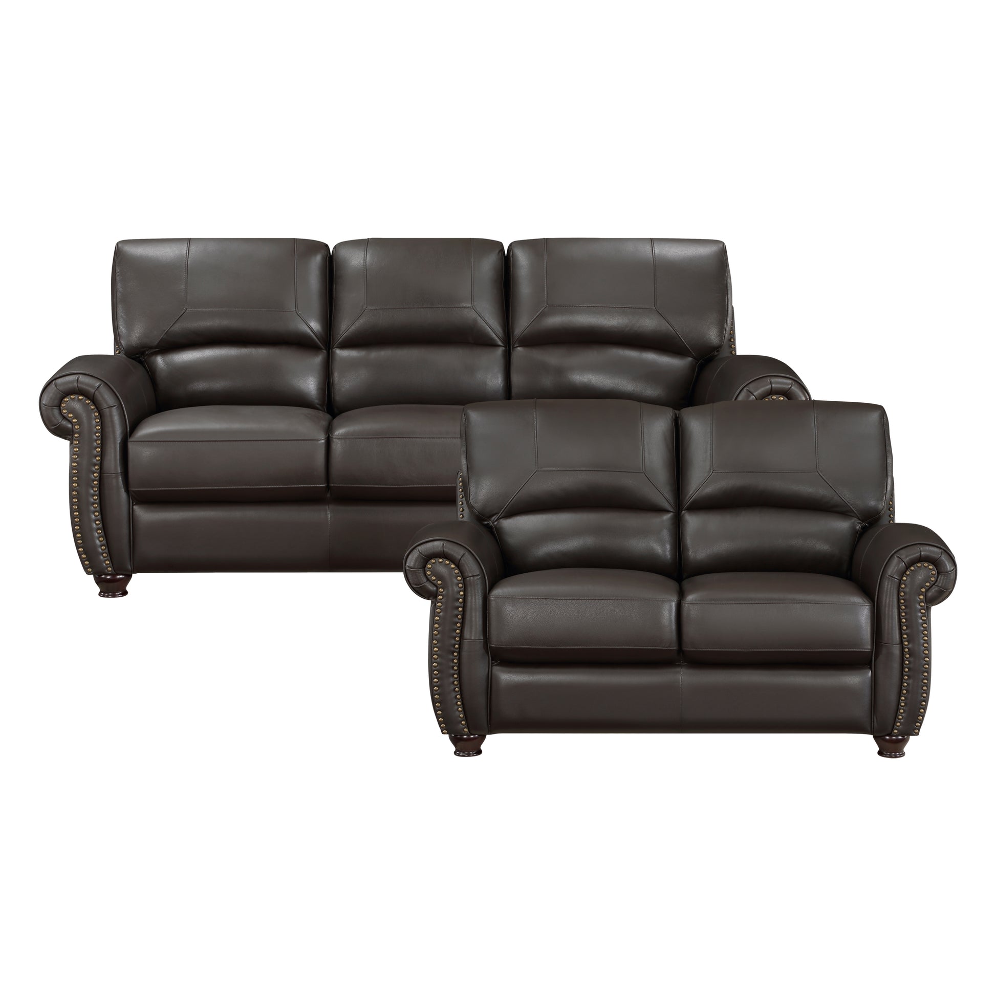 Traditional design and classic accents are paired to create the timeless look of the Foxborough Collection. Dark brown top-grain leather covers the plush seating of the sofa, love seat, and chair everywhere the hand touches – with faux leather match covering the remaining areas. The profile of the seating arrangement is defined by elegantly rolled arms, plush seatbacks, and nailhead trim.