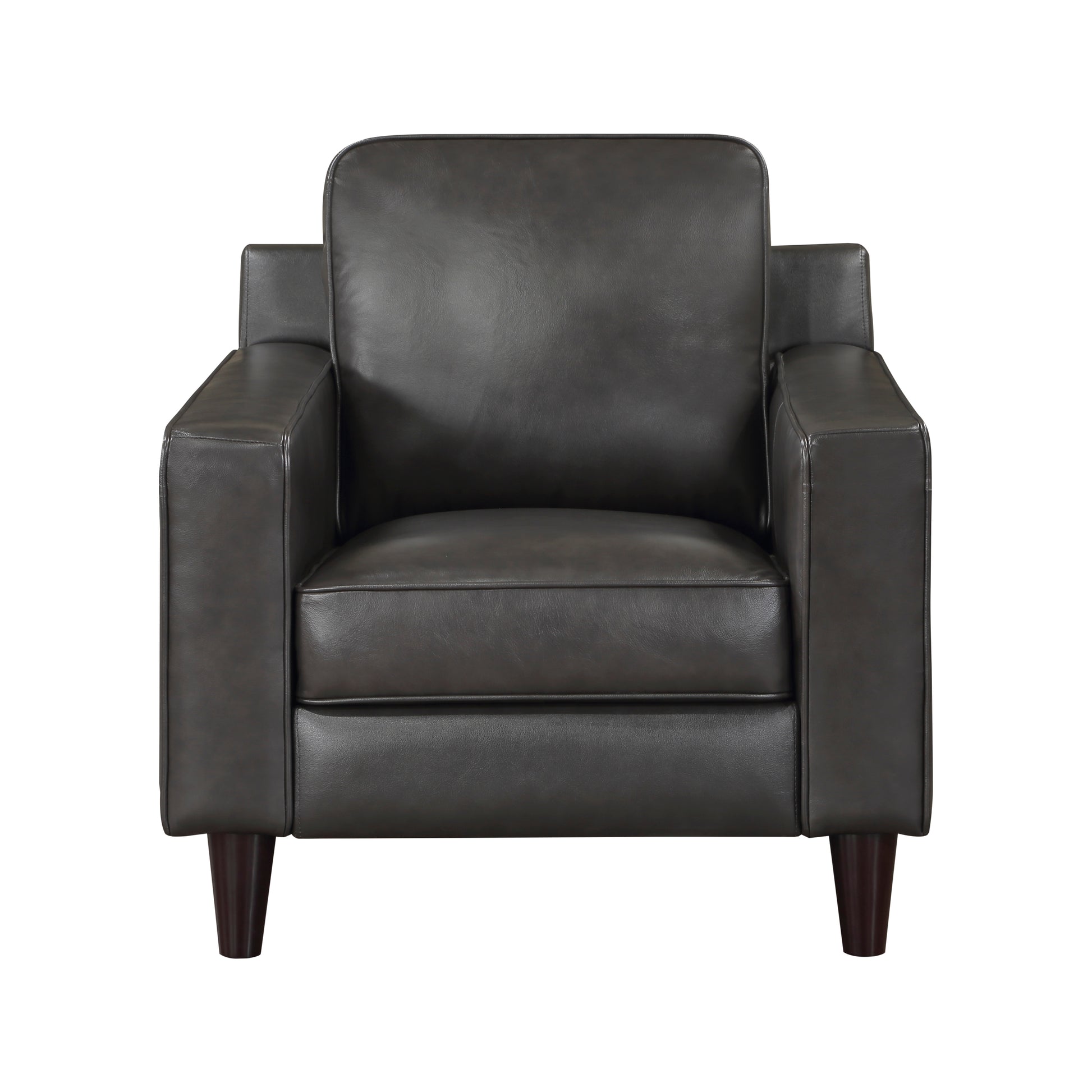 The tailored lines of the Aldrich Collection harken to the retro-inspired refinement of mid-century design, their understated elegance a perfect pairing for your living room. Gray genuine leather covers the frame of the chair, where the body touches, with faux leather match everywhere else. The modern profile of the collection is supported by conical legs, while track arms define the timeless look.